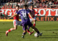 Insgesamt entwickelte sich in der Anfangsviertelstunde eine ausgeglichene Begegnung, in der beide Teams zunächst auf Stabilität bedacht waren. Das Spiel war von vielen Zweikämpfen im Mittelfeld geprägt, echte Torchancen blieben Mangelware. Beide Defensivreihen standen kompakt, das Geschehen spielte sich überwiegend zwischen den Strafräumen ab. Nach einer guten halben Stunde sah King Manu Gelb, als er einen Umschaltmoment der Gäste per taktischem Foul unterband (30.). Kurz vor der Pause drängte sich Osnabrück nochmal etwas stärker auf, kombinierte sich gut in Strafraumnähe, doch der letzte Pass blieb zu unpräzise, sodass Manu per Hacke klären konnte (39.). Auch Energie Cottbus setzte in der 42. Minute nochmal einen kleinen Arbeitsnachweis vor dem Halbzeitpfiff: Henry Rorig brachte einen scharf getretenen Freistoß von links in den Strafraum, King Manu stieg am höchsten, konnte dem Kopfball aber letztendlich weder Wucht noch Platzierung mitgeben. So blieb es zur Pause bei einem 0:0 der eher unspektakulären Sorte.