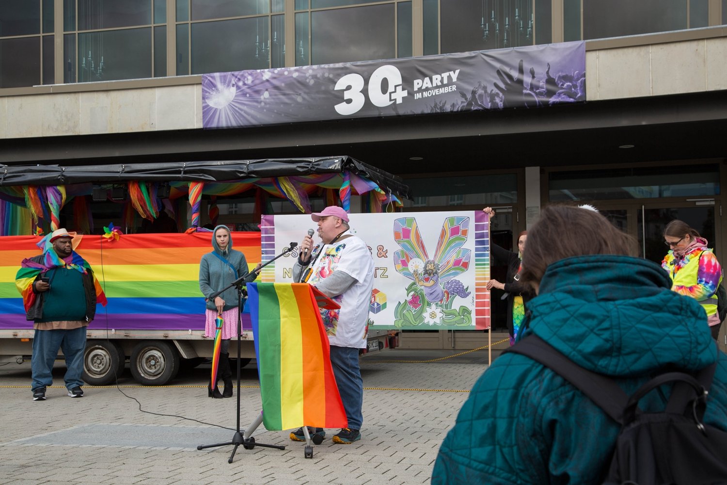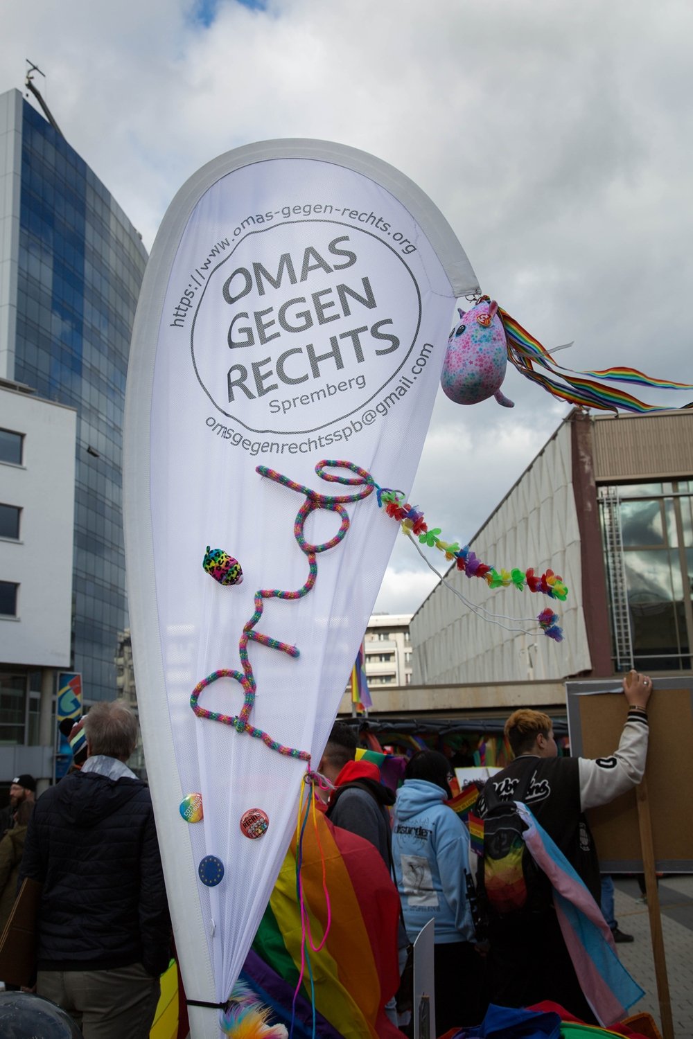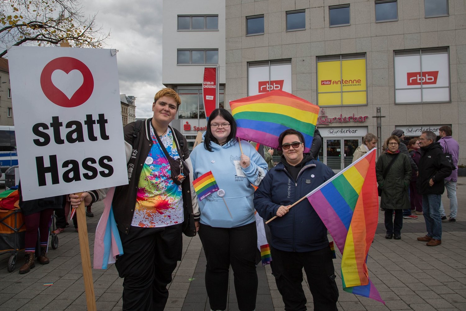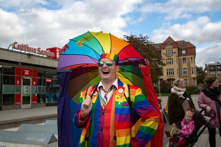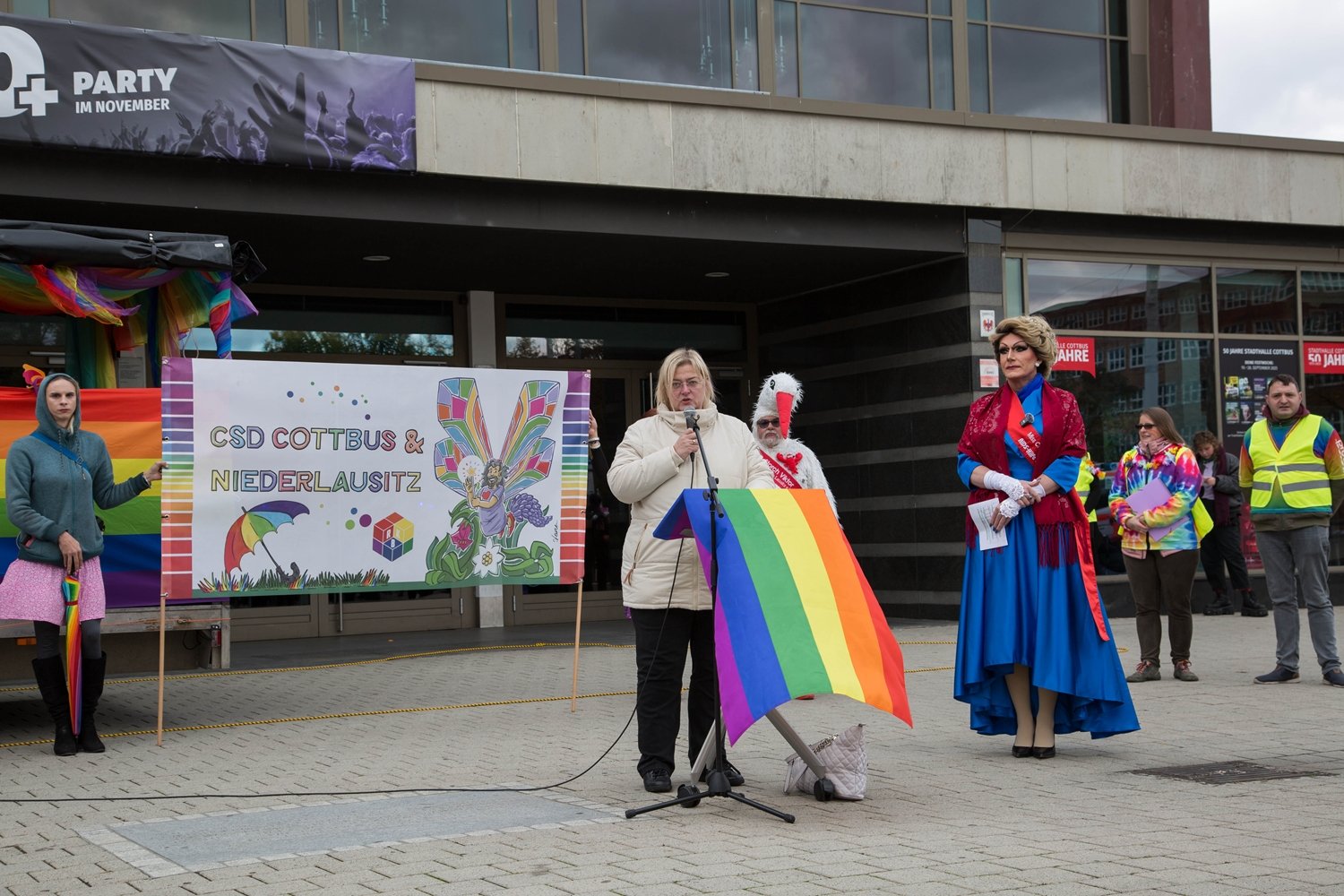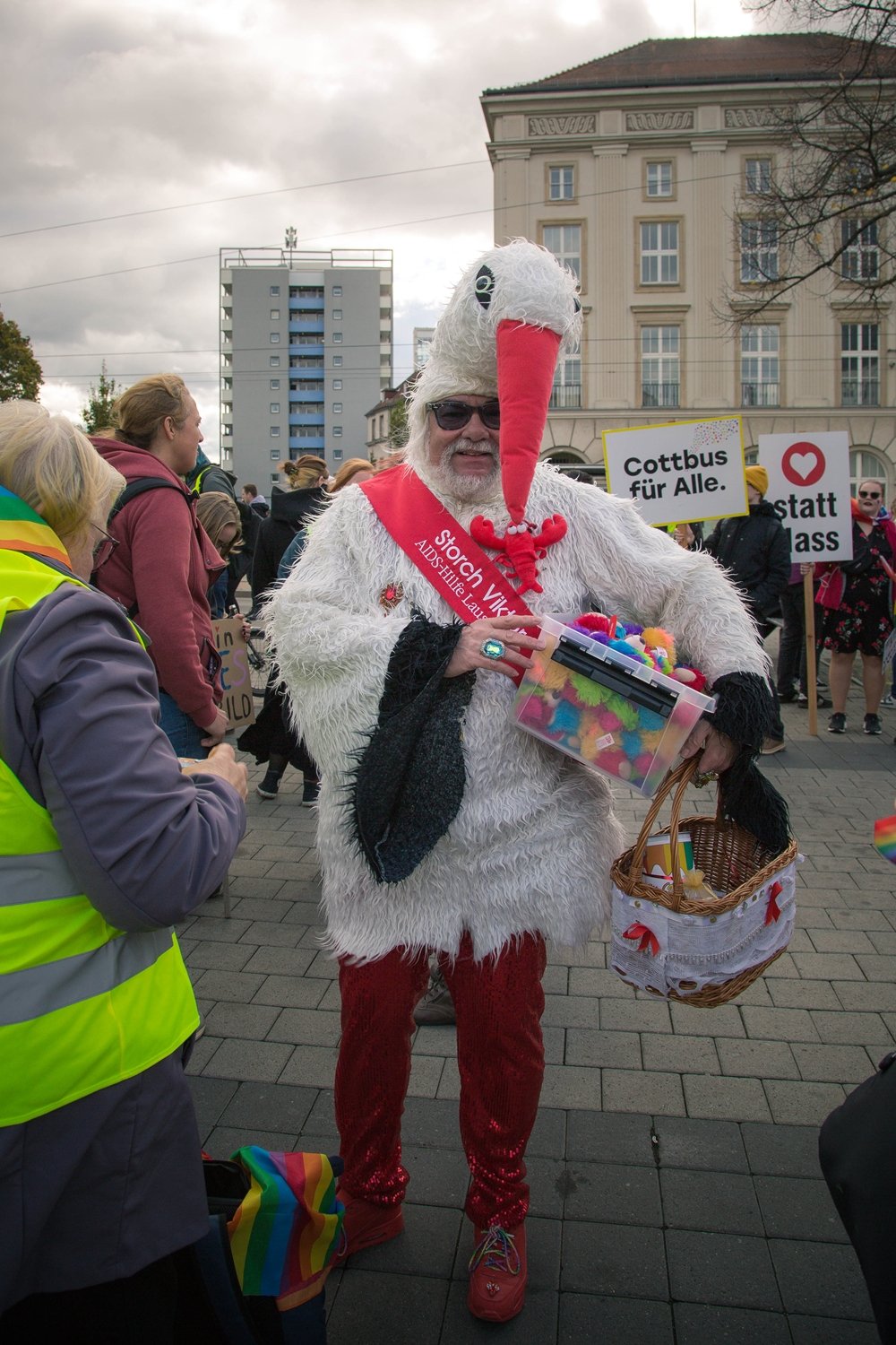 Vor der Stadthalle wummerten am frühen Nachmittag die Bässe, fröhliche Menschen tanzten in Regenbogenfahnen gehüllt. Sie wollen ein Zeichen für Vielfalt, Liebe und gegenseitigen Respekt setzen, weil sie oftmals nicht in die traditionellen Vorstellungen von Sexualität und Geschlecht passen. Vorstandsvorsitzender Michael Ziltz eröffnete die Demo mit leichter Verspätung und einer langen Liste von Sicherheitshinweisen. Miss Cherry Moonlight und Storch Viktor unterstützen auch in diesem Jahr wieder mit viel Herzblut die Aidshilfe in der Lausitz.