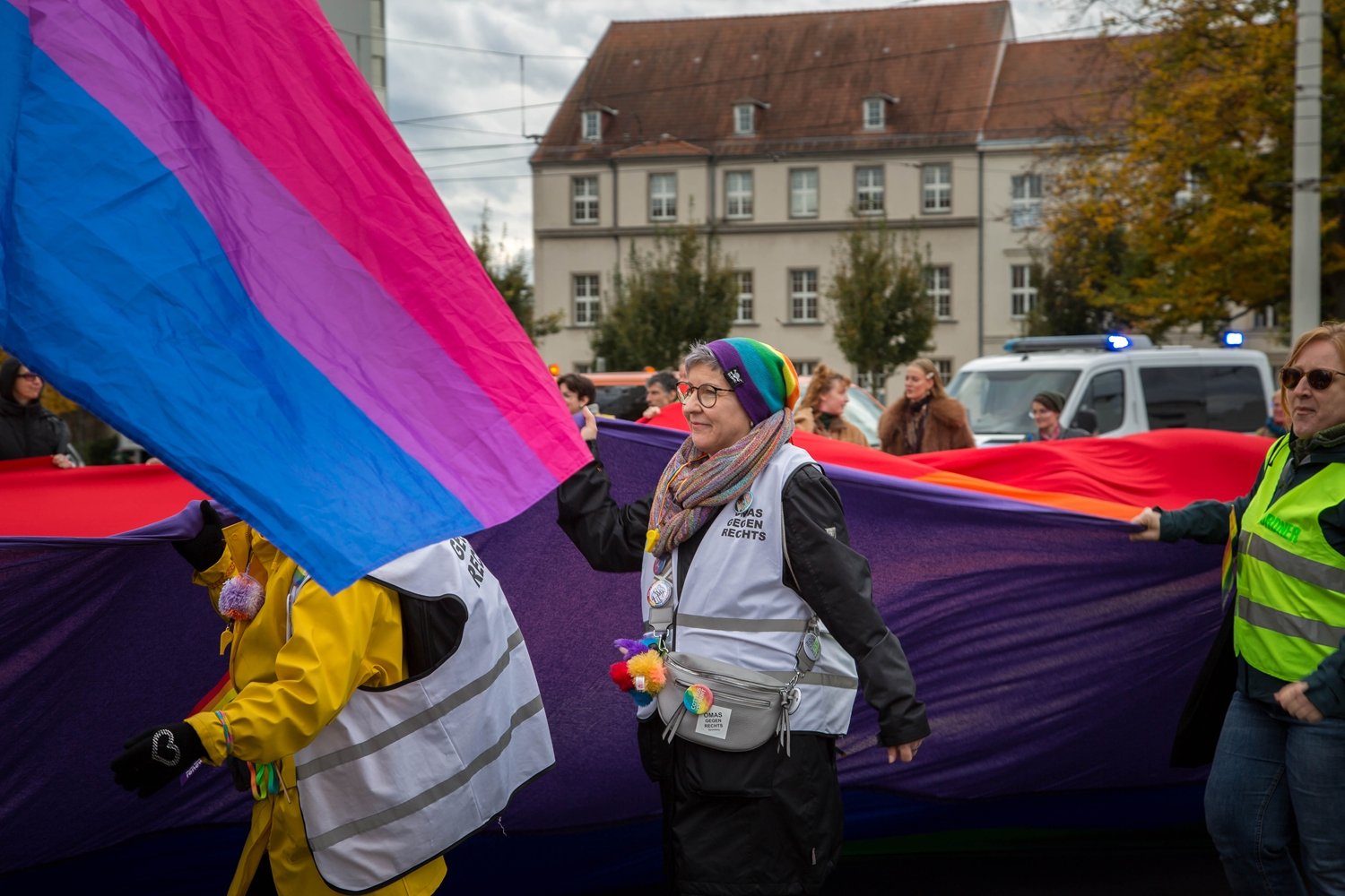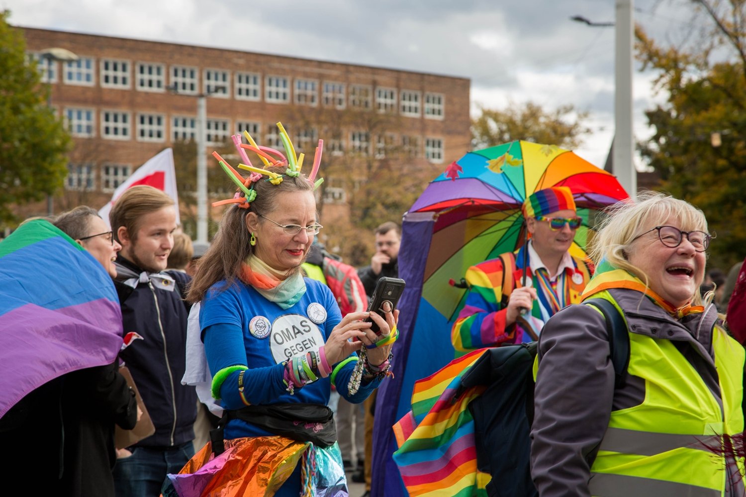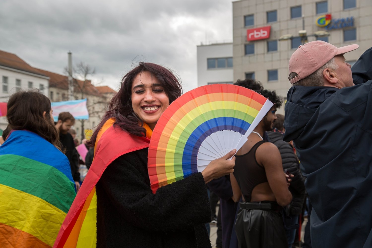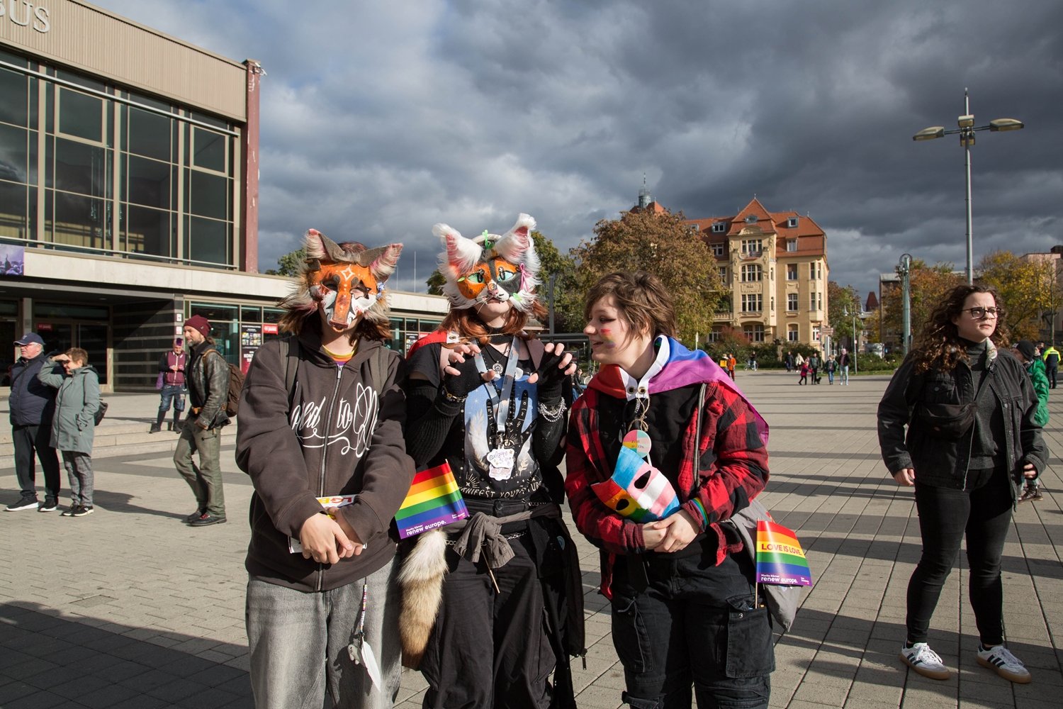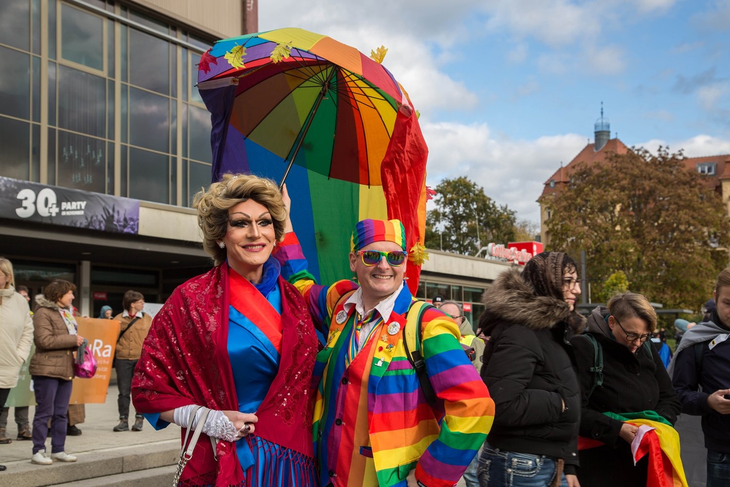 Vor der Stadthalle wummerten am frühen Nachmittag die Bässe, fröhliche Menschen tanzten in Regenbogenfahnen gehüllt. Sie wollen ein Zeichen für Vielfalt, Liebe und gegenseitigen Respekt setzen, weil sie oftmals nicht in die traditionellen Vorstellungen von Sexualität und Geschlecht passen. Vorstandsvorsitzender Michael Ziltz eröffnete die Demo mit leichter Verspätung und einer langen Liste von Sicherheitshinweisen. Miss Cherry Moonlight und Storch Viktor unterstützen auch in diesem Jahr wieder mit viel Herzblut die Aidshilfe in der Lausitz.