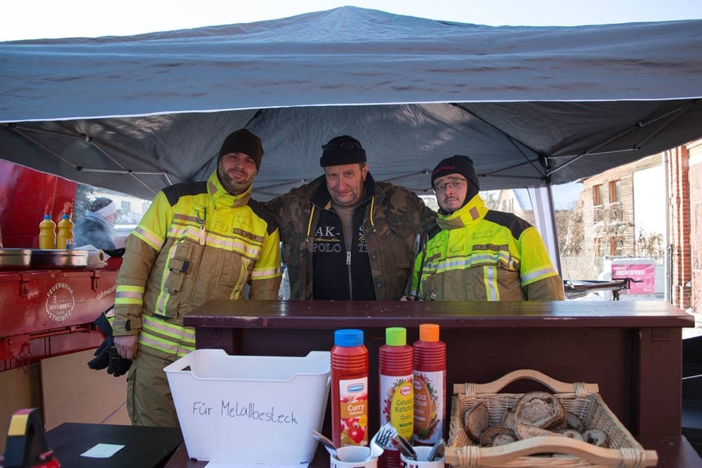 Bereits morgens um 6 Uhr wurde die Gulaschkanone angefeuert, damit 140 Eisbeine pünktlich zur Mittagszeit gar sind. Auch Bratwurst sowie frisch gebackene Eierplinse, Kuchen, Kaffee, Schmalzstullen und Glühwein fanden großen Anklang bei den Gästen.