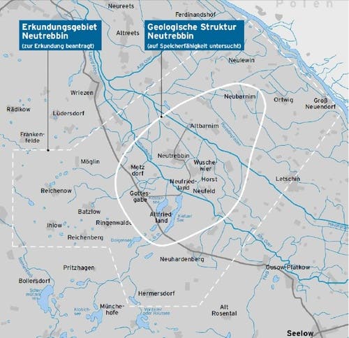 Die Vattenfall Europe Mining AG hat am 16. März 2010 vom Brandenburgischen Landesamt für Bergbau, Geologie und Rohstoffe (LBGR) die bergrechtliche Erlaubnis zur Erkundung des Untergrundes im Untersuchungsgebiet Neutrebbin erhalten. Dieser soll auf seine Eignung als CO2-Endlager erforscht werden. Das sog. Erlaubnisfeld (Abbildung 1) mit der Feldnummer 11-1541 umfasst eine Fläche von rund 353 km². Gegenstand der Erkundungen sind die salzwasserführenden Sandsteine der Mittleren Buntsandstein-Formation in einer Tiefe 1200 bis 1500 m Tiefe und die darüber liegenden tonigen Deckschichten.(1.1) Die Erlaubnis gestattet der Vattenfall Europe Mining AG die Durchführung von seismischen Erkundungsarbeiten und Tiefbohrungen. Für die einzelnen Maßnahmen müssen aber noch Sonderbetriebspläne eingereicht werden. Die bergrechtliche Erlaubnis ermöglicht somit nicht die CO2-Endlagerung, sondern ist ein wichtiger Schritt auf dieser Erlaubnisleiter. Die Endlagerung muss im Rahmen eines Planfeststellungsverfahrens genehmigt werden.