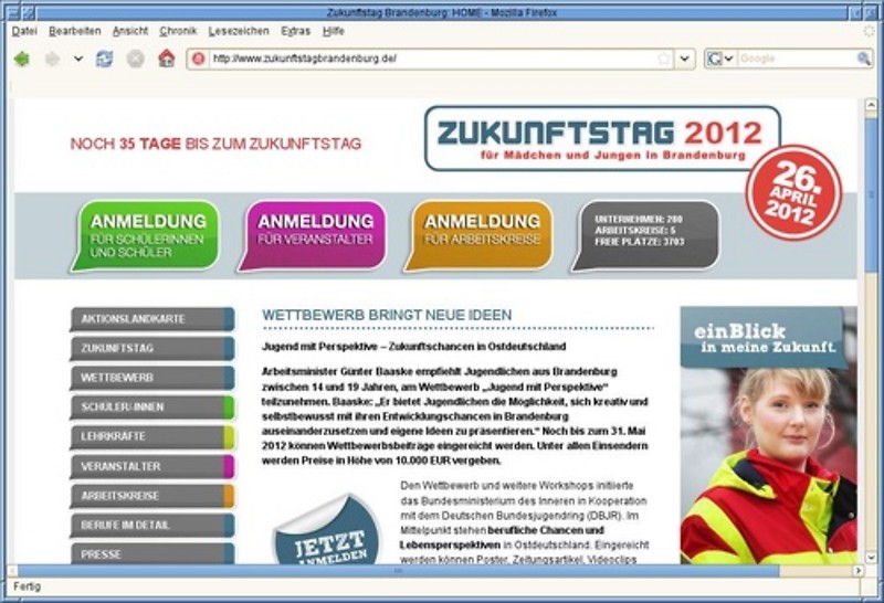 Der Zukunftstag 2012 findet dieses Jahr am 26. April in ganz Brandenburg statt. Viele Unternehmen, Verwaltungen oder auch Hochschulen öffnen an diesem Tag ihre Türen, um Schülerinnen und Schülern einen Einblick in die Berufswelt zu ermöglichen. In Elbe-Elster (4 Veranstalter), Dahme-Spreewald (18), Oberspreewald-Lausitz (6) und Teltow-Fläming (22) haben sich bereits insgesamt 50 Veranstalter über die Internetseite angemeldet, um den Jugendlichen ihre Arbeitswelt näher zu bringen. Von den im Moment angebotenen 1.267 Plätzen – davon 210 in Elbe-Elster, 194 in Oberspreewald-Lausitz, 640 in Dahme-Spreewald und 223 in Teltow-Fläming – stehen noch einige zur Verfügung:
