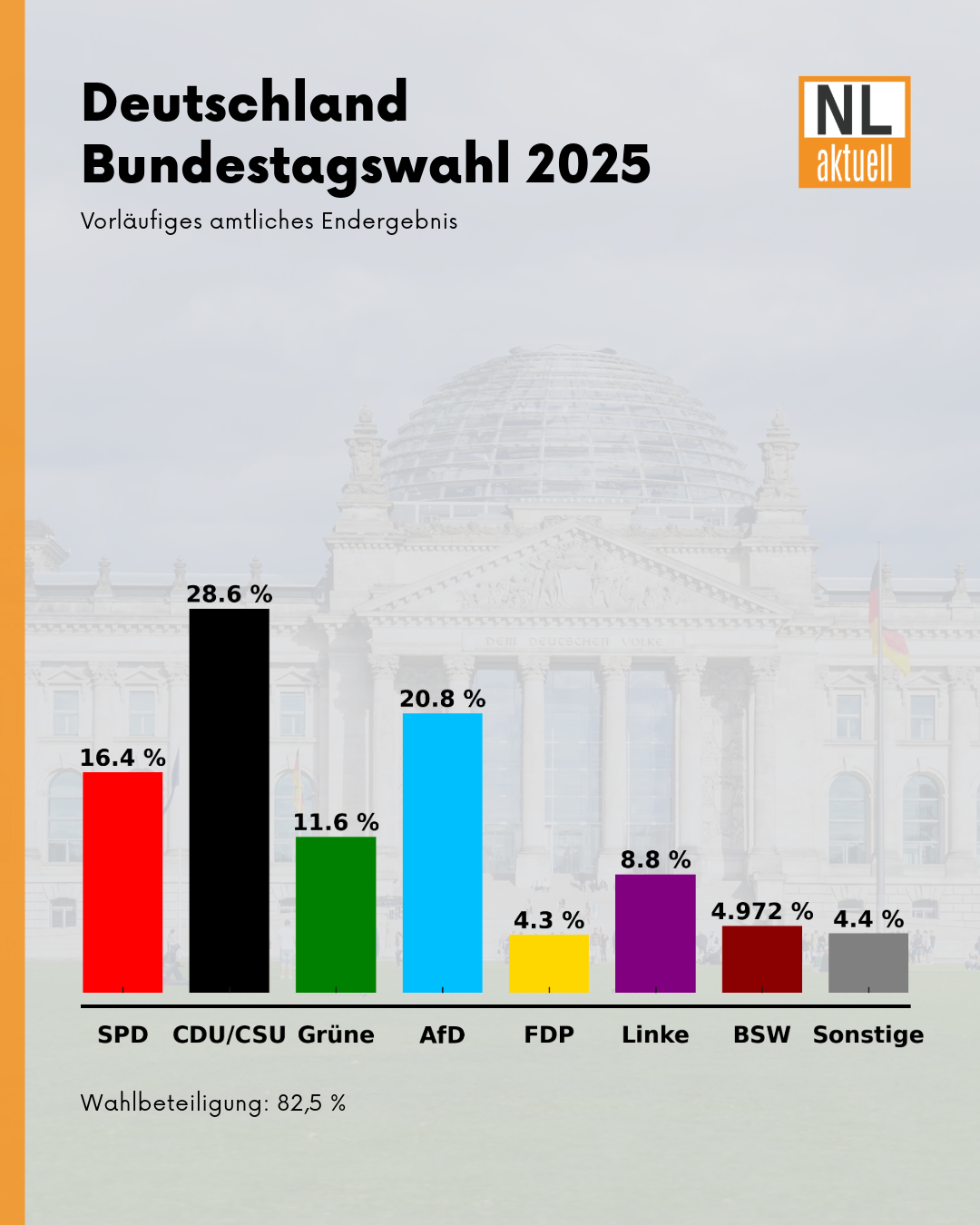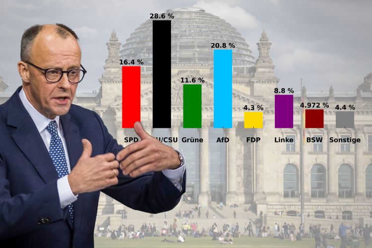 Die Union aus CDU/CSU wird mit 28,6 % stärkste Kraft. Die AfD erreicht 20,8 % und hat ihr Ergebnis so gut wie verdoppelt. Die SPD verliert deutlich und kommt auf 16,4 %. Die Grünen verlieren und stehen bei 11,6 %. Die Linke gewinnt deutlich und landet bei 8,8 %. Das Bündnis Sahra Wagenknecht (BSW) erreicht 4,972 % und verpasst sehr knapp den Einzug in den Bundestag. Die FDP fällt auf 4,3 % und verabschiedet sich als der Teil der Ampel-Regierung nun gänzlich aus dem Bundestag. Die sonstigen Parteien kommen auf 4,4 %.