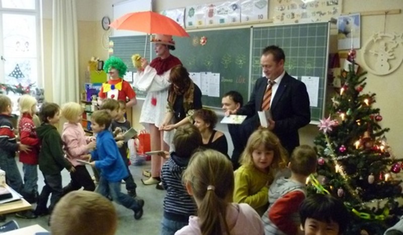 Ein kleiner Riese wird ausgelacht, weil er einfach nicht wächst. Er läuft fort und für ihn beginnt ein spannendes Abenteuer. Davon handelt das Buch „Es muss auch kleine Riesen geben“, das die Erstklässler geschenkt bekamen. Ein weiteres Buch mit dem Titel „Spaß im Zirkus Tamtini“ wurde den Kindern der 2. Klassen übergeben. Verstärkung erhielten Rotarier Wolfram Walter und die Rotaracter dabei vom Theaterkünstler Ronne Noack sowie seinem Lehrling Paul vom Cottbuser Kindermusical, die als Clowns für eine lustige Bücherübergabe sorgten. Für manche Kinder ist dies das erste eigene Buch überhaupt. Die Lehrer erhielten unterstützend dazu ein professionell ausgearbeitetes didaktisches Handbuch zur Begleitung eines fächerübergreifenden Unterrichts. Ziel dieser Aktion ist die Förderung des Leseverständnisses und eine lebenslange Lesemotivation.