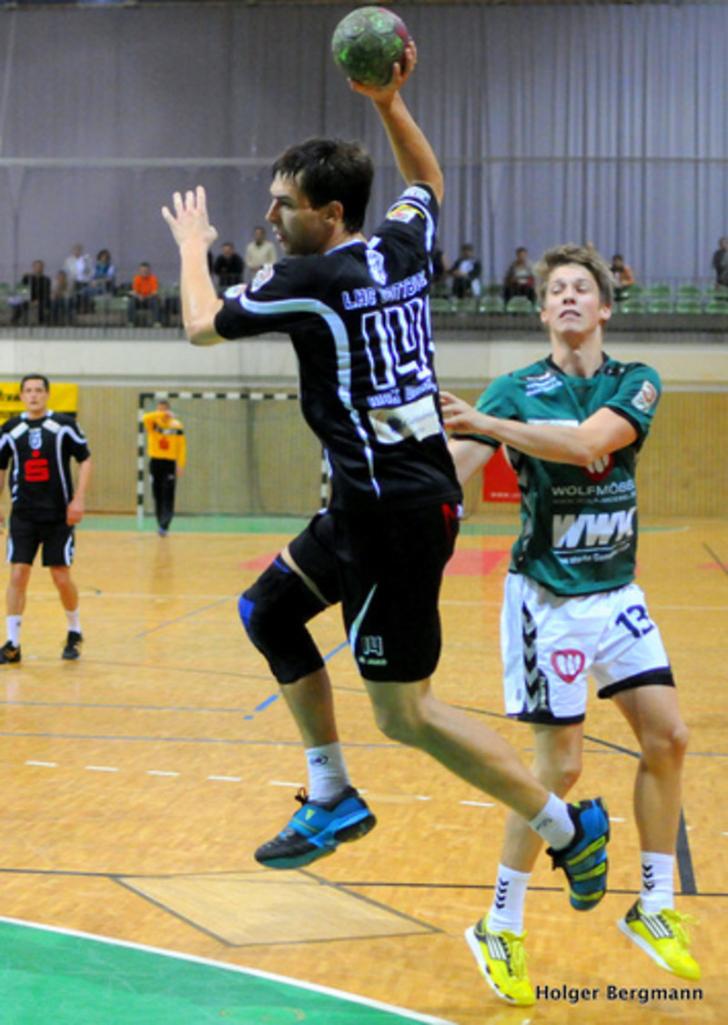 Nun aber der Reihe nach. Die heimischen Wölfe wunderten sich, als das Spiel angepfiffen wurde und sie weder die gewohnte 6:0-Deckung noch die variable 3:2:1-Deckung der Cottbuser gegenüberstand. Das Trainerteam um Marcel Linge und Falk Fürstenberg hatte sich etwas besonderes ausgedacht und starteten mit einer 4:2-Deckung. Mit dieser Variante kamen die teils statischen Spieler aus Rimpar kaum klar, sodass der LHC nach acht Minuten mit zwei Toren in Front lag. Dies war jedoch die einzige Führung der Lauitzer in der Fremde. In den Anfangsminuten ein Schock für beide Mannschaften. Nachdem Daniel Sauer bei einer Abwehraktion mit Robert Takev zusammengestoßen ist mussten beide behandelt werden und konnten nicht mehr in die Partie eingreifen. Das erste Tor der Rimparer fiel durch einen 7-Meter-Strafwurf, was wie eine kleine Initialzündung wirkte. Von da an entwickelte sich ein Spiel auf Augenhöhe, sodass nicht zu erkennen war, welche der Mannschaften auf dem Aufstiegsplatz und welche im Tabellenkeller steht. Der heiße Schlagabtausch setzte sich bis zur Halbzeit fort und somit ging es verdient mit 13:12 Toren in die Pause.