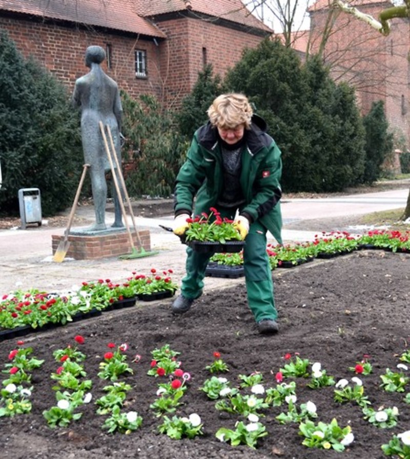 Fleißig mit dem Auspflanzen von Frühlingsblühern beschäftigt sind in diesen Tagen zahlreiche MitarbeiterInnen des Betriebes Grün- und Parkanlagen der Stadt Cottbus. Nach dem Schillerplatz am Theater waren die Frauen und Männer am heutigen Donnerstag im Bereich der Stadtpromenade und am Brandenburger Platz emsig dabei, rote und weiße „Tausendschönchen“ in den aufgelockerten aber noch winterkalten Boden zu setzen. Allein auf dieser ersten Rabatte an der alten Stadtmauer (Bild links) sind es rund 900 zarte Pflänzchen, in deren Umgebung überall noch die hoffentlich letzten Schneereste eines der längsten und kältesten Winter seit über 100 Jahren liegen. Wenn wie von Wetterexperten vorausgesagt, in der kommenden Woche die Temperaturen deutlich steigen, dann werden die Tausende „Tausendschönchen“ und andere bunte Blumen garantiert auch die Blicke der Passanten auf sich ziehen und viele Menschen erfreuen.
