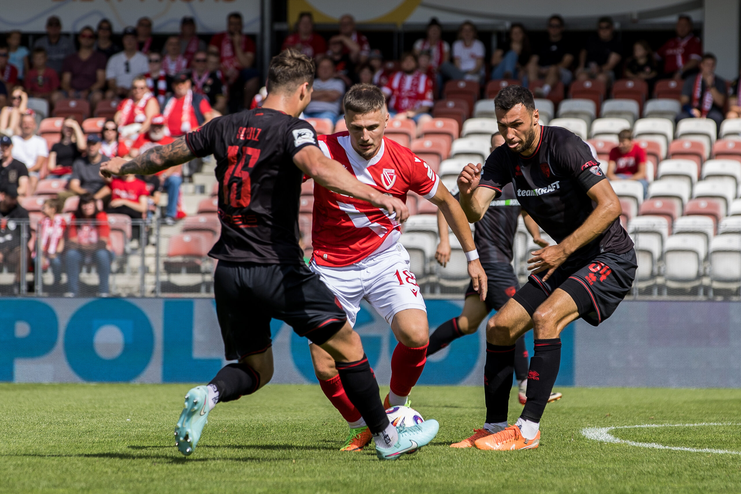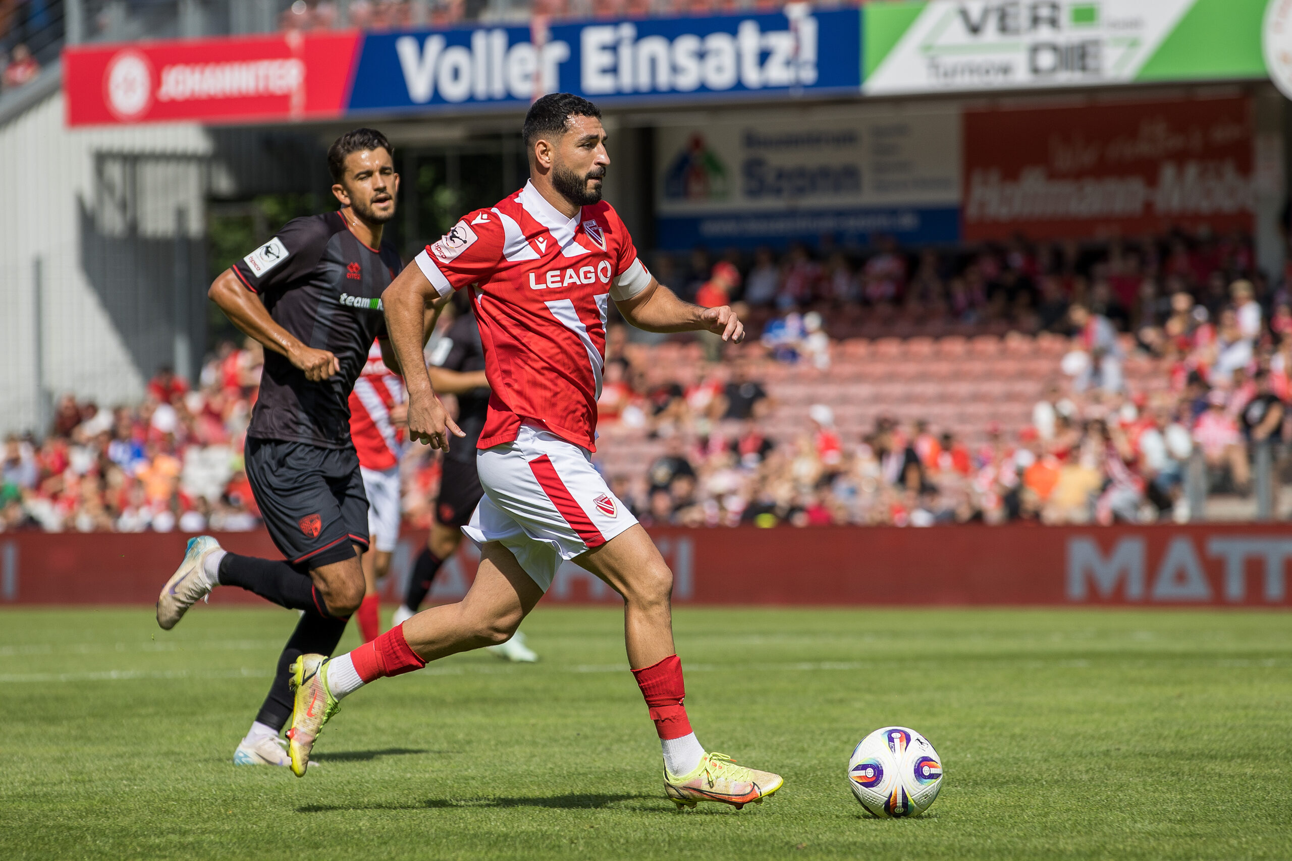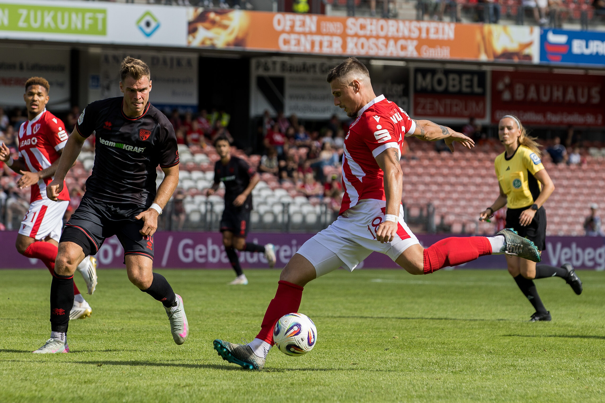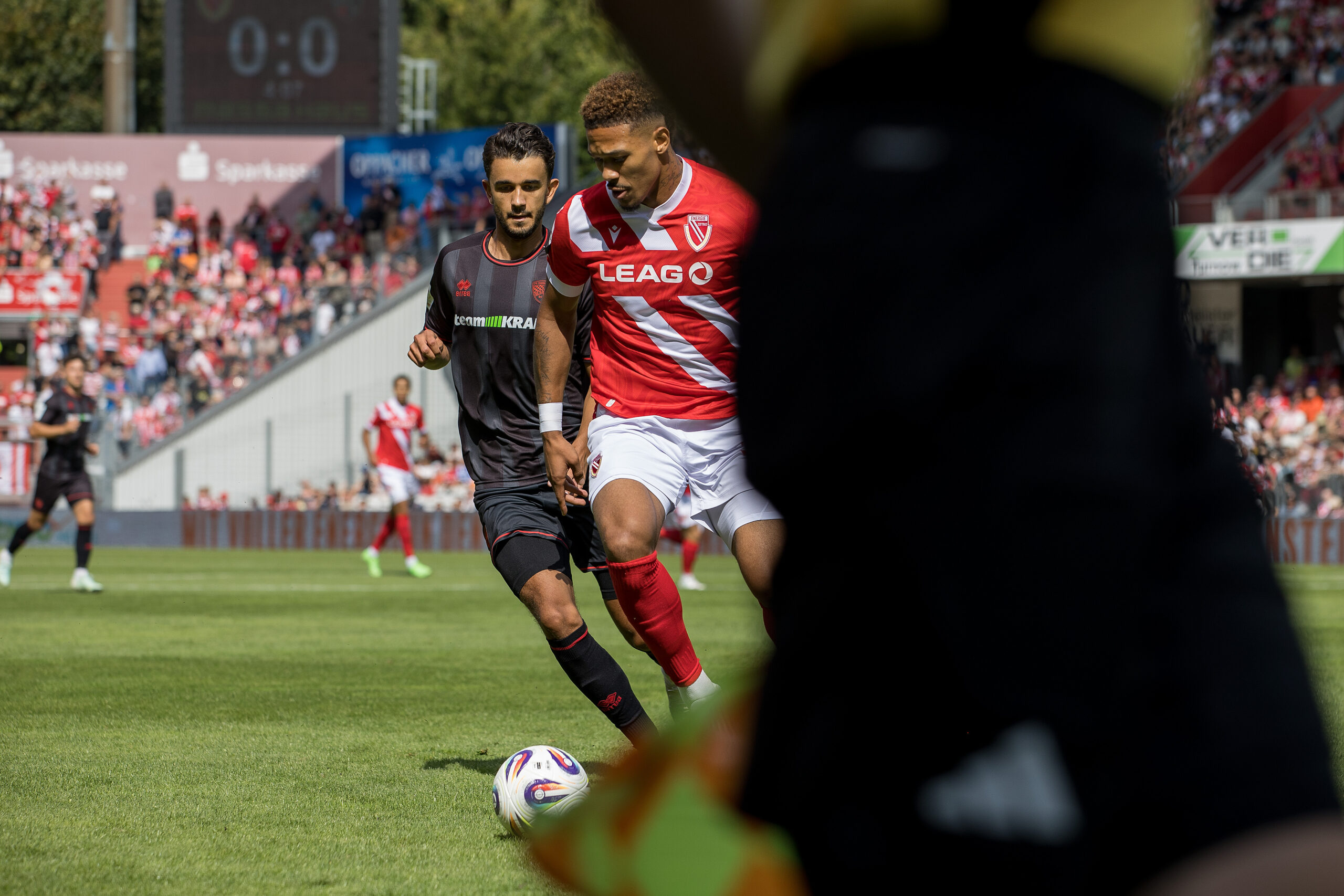 Die Gäste kamen zunächst kaum nach vorn, setzten in der 12. Minute jedoch den ersten Torschuss ab, den Keeper Alexander Sebald nur abklatschen lassen konnte. Auf der Gegenseite überzeugte Energie mit aggressivem Pressing, bei dem vor allem Dominik Pelivan im Mittelfeld wichtige Ballgewinne verbuchte. Nach gut 20 Minuten meldete sich Ingolstadt mit der bis dahin besten Chance, als Sebald nach einem Eckball zunächst mit dem Fuß rettete und ein Cottbuser Abwehrspieler den Nachschuss blockte. Cottbus antwortete prompt: Zunächst prüfte Cigerci Ingolstadts Keeper Ponath aus der Distanz (29.), dann scheiterten Engelhardt und Butler in kurzer Folge nur knapp (30.). In der 33. Minute folgte schließlich der verdiente Lohn für Rot-Weiß: Nach einem Handspiel vom eingewechselten Deichmann entschied Schiedsrichterin Fabienne Michel auf Strafstoß. Tolcay Cigerci verwandelte souverän zur 1:0-Führung. Kurz vor der Pause kam Ingolstadt noch einmal gefährlich zum Abschluss, doch Sebald parierte den Versuch von Scholz reaktionsschnell. Mit einer knappen, aber verdienten, Führung für den FCE ging es in die Kabinen.