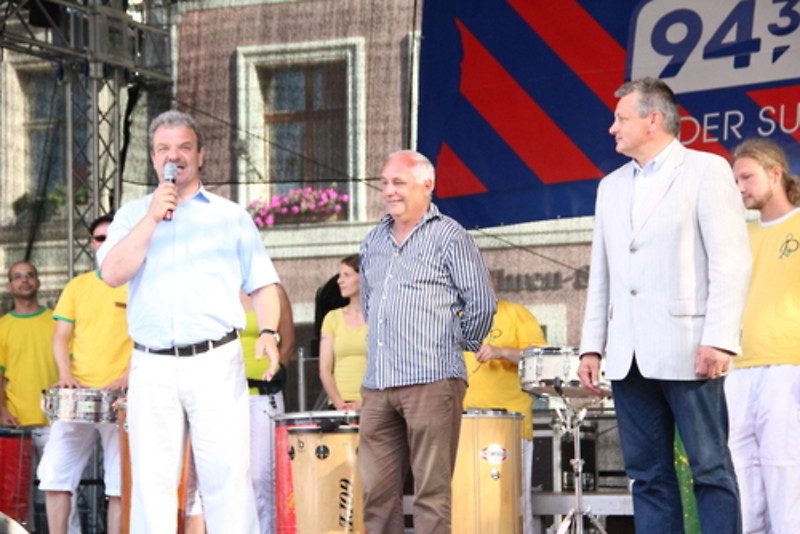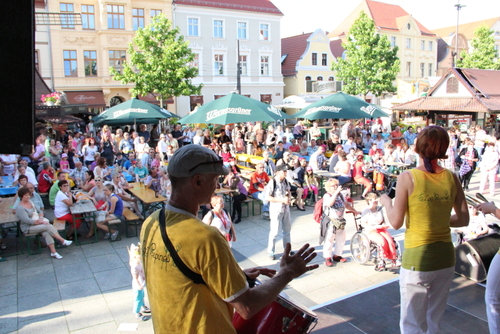 Mit einem Trommelwirbel der „Los Pepinos“ wurde auf der Bühne Altmarkt das Stadtfest offiziell eröffnet. OB Frank Szymanski konnte auch eine Delegation aus der Partnerstadt Zielona Gora begrüßen.