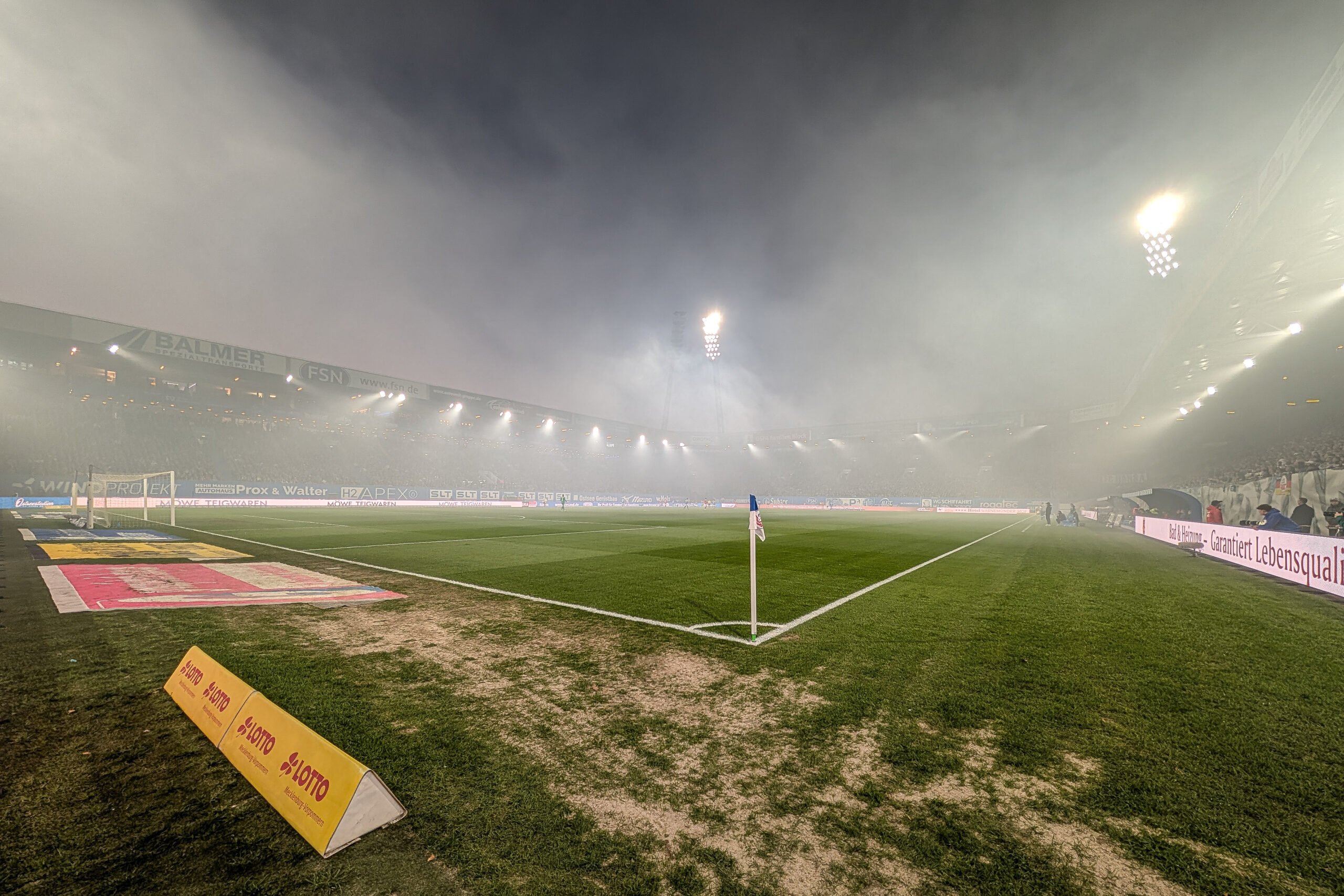 Nach dem klaren 5:0-Erfolg gegen den VfB Stuttgart II veränderte Claus-Dieter Wollitz seine Mannschaft auf drei Positionen. Lucoqui, Campulka und Boziaris nahmen zunächst auf der Bank Platz, dafür rückten Awortwie-Grant, Michelbrink und Hannemann in die Startelf. Das Ostderby begann dabei mit einem ordentlichen Schreckmoment für die Gäste. Bereits in der 3. Minute hatte Hansa Rostock die Riesenchance zur Führung: Dietze erkämpfte den Ball an der Grundlinie und legte für Naderi auf, der quer ins Zentrum spielte. Fatkic stand frei vor Funk, schob den Ball aber aus sechs Metern vorbei – das musste eigentlich das frühe 1:0 für die Kogge sein. Kurz darauf wurde die Partie für einige Minuten wegen dichter Rauchschwaden aus der Rostocker Kurve unterbrochen (5.). Danach blieb Hansa zunächst die aktivere Mannschaft, während Energie offensiv kaum Akzente setzen konnte und vor allem in den Zweikämpfen gefordert war.