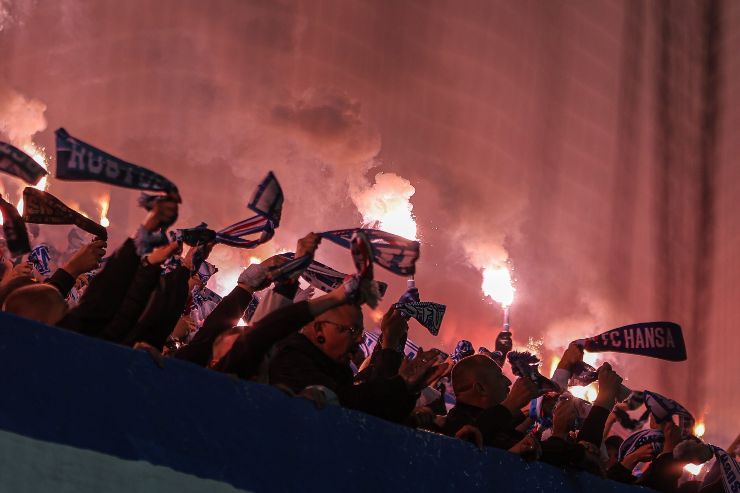 In der 27. Minute verpassten die Hanseaten nach einem Freistoß von der Strafraumkante erneut die Führung, als der Ball an Freund und Feind vorbeirutschte. Cottbus nutzte dagegen seine erste echte Gelegenheit eiskalt: Nach einem Eckball zog Hertha-Leihgabe Lukas Michelbrink aus der Distanz ab, Hannemann stand im Strafraum goldrichtig und vollendete mit der Hacke zum 1:0 (36.). Rostock antwortete allerdings noch vor der Pause. Ryan Naderi setzte sich auf dem Flügel durch und traf aus spitzem Winkel durch die Beine von Funk zum 1:1-Ausgleich (43.). Wegen der langen Pyro-Unterbrechung gab es zehn Minuten Nachspielzeit, ehe es mit dem Unentschieden in die Kabinen ging.