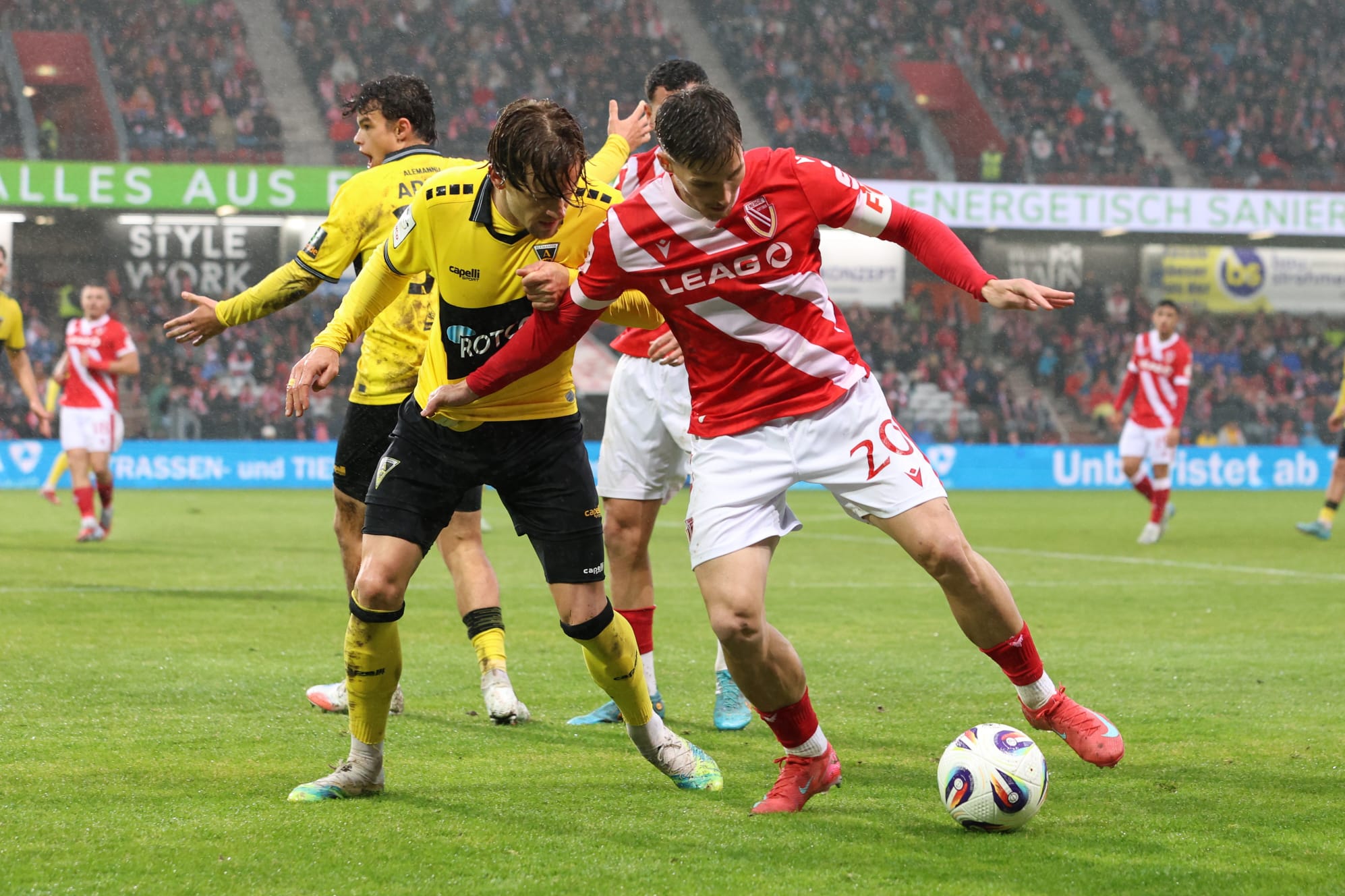 Cottbus tat sich zunächst schwer, kam aber über Standards zurück ins Spiel. Zwei Eckbälle brachten noch nichts ein, doch in der 21. Minute schlug der frischgebackene Vater Tolcay Cigerci zu. Erst scheiterte er mit seinem Freistoß an der Mauer, den Nachschuss aber schlenzte er unhaltbar ins Netz – 1:1. Die Cottbuser Freude währte jedoch nur kurz. Bereits vier Minuten später nutzte Aachen eine Lücke in der Cottbuser Abwehr. Schroers setzte sich im Strafraum gegen Awortwie-Grant durch und traf anschließend frei vor Funk zum 1:2 (25.). Energie blieb dennoch gefährlich. Boziaris prüfte Aachens Keeper Olschowsky per Seitfallzieher (29.), der aber stark parierte. Bis zur Pause entwickelte sich ein offenes Spiel mit Chancen auf beiden Seiten. Cottbus presste gewohnt hoch und versuchte Druck aufzubauen, während Aachen die sich öffnenden Räume geschickt für schnelle Gegenangriffe nutzte. Hohe Intensität in dieser Spielphase auch auf den beiden Cottbuser Innenverteidigern King Manu und Nyamekye Awortwie-Grant.