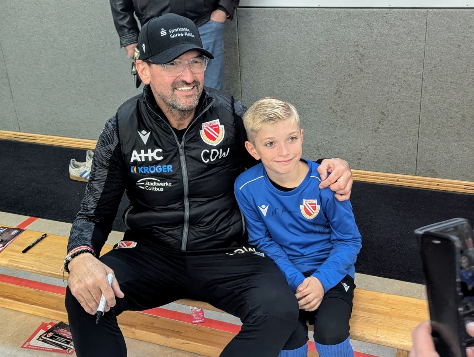 Für Claus-Dieter Wollitz war der Besuch beim Feriencamp eine Herzensangelegenheit. „Das bedeutet mir sehr viel“, sagte der FCE-Cheftrainer. „Vor allen Dingen, wenn das so angenehm ist, so höflich, so respektvoll, so unfassbar bescheiden, wie die Kinder sich hier verhalten haben. Das ist nicht selbstverständlich.“ Er ergänzte: „Ich freue mich, dass es so eine große Anzahl ist, wo man sieht, dass die Zukunft da ist.“