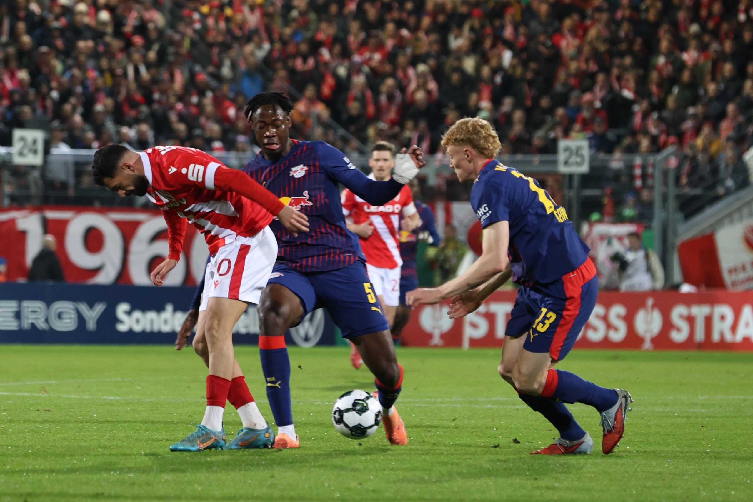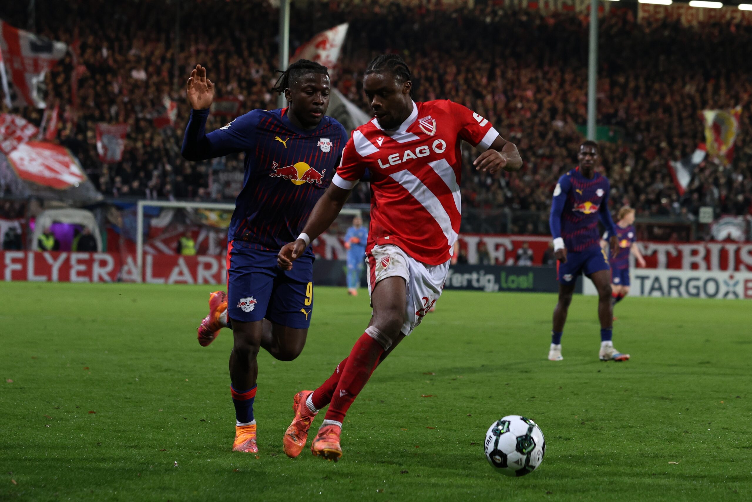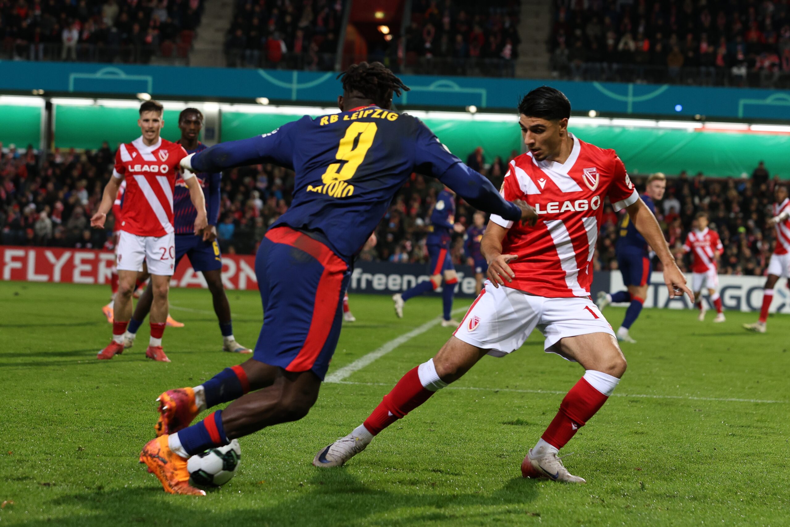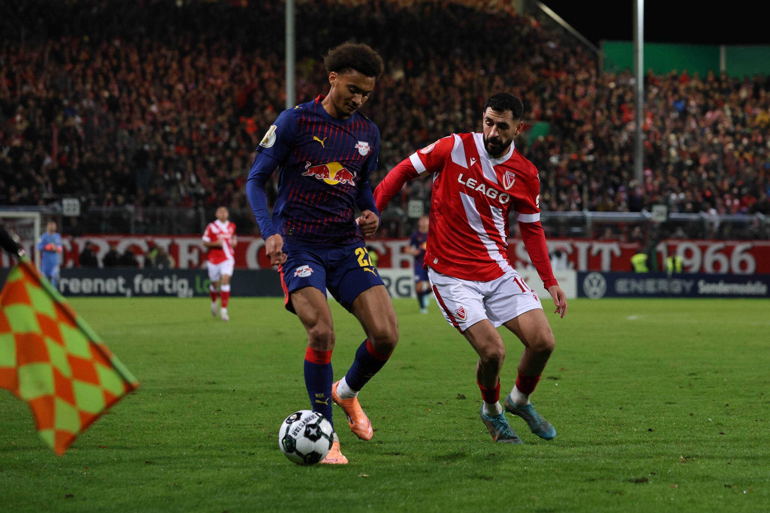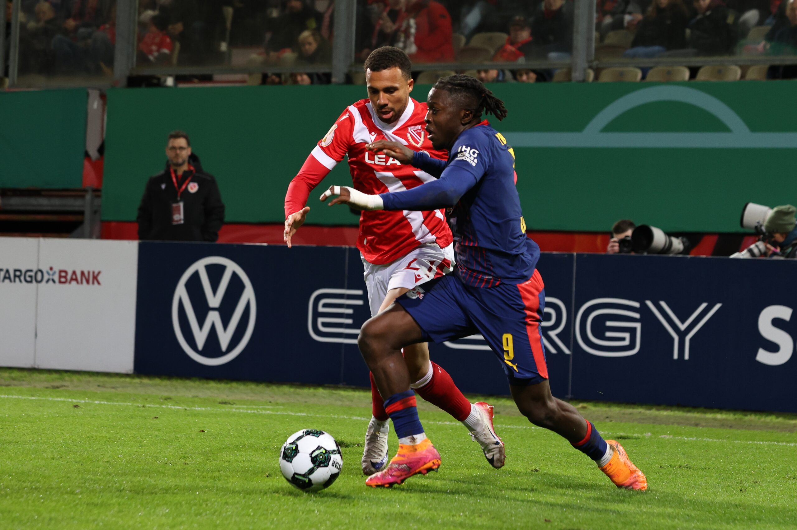 Dann aber schlug der Favorit zu. Leipzigs Johan Bakayoko nutzte in der 12. Minute die erste echte Unaufmerksamkeit der Cottbuser Defensive, setzte sich individuell stark durch und traf zum 0:1. Der Bundesligist übernahm zunehmend die Kontrolle, kombinierte sicher und kam in der 28. Minute nach einer Ecke von David Raum zum 0:2: Christoph Baumgartner stieg am höchsten und köpfte wuchtig ein. Vorausgegangen war ein Ballverlust in der Cottbuser Hintermannschaft. Energie versuchte anschließend, wieder eigene Akzente zu setzen, doch Biankadi scheiterte erneut an Leipzigs Schlussmann (31.). Kurz vor der Pause erhöhte der Favorit weiter: Nach einem Freistoß aus dem Halbfeld stand Baumgartner völlig frei und markierte seinen zweiten Treffer des Abends (37.). Mit einem klaren 0:3-Rückstand ging es für die Lausitzer in die Kabine.