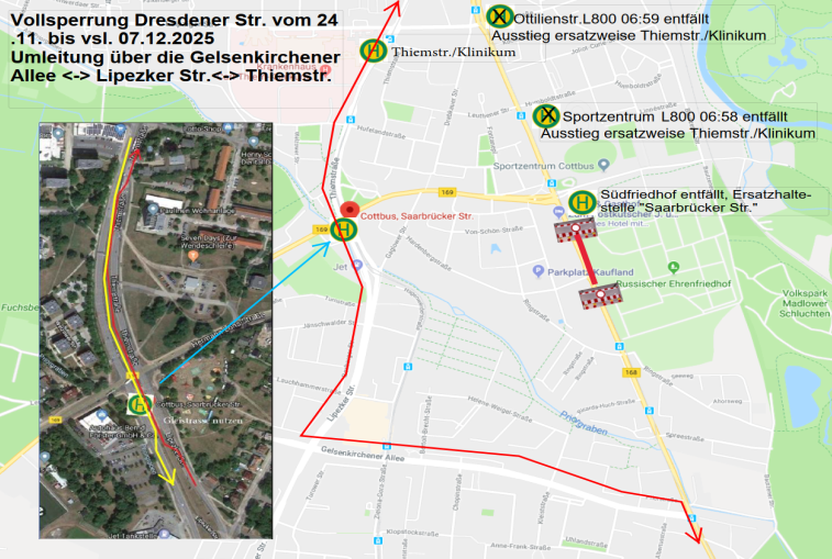 In Cottbus wird die Dresdener Straße ab dem 24. November 2025 bis voraussichtlich 7. Dezember 2025 voll gesperrt. Die Bauarbeiten betreffen den Abschnitt zwischen Gelsenkirchener Allee und Hermann-Löns-Straße. Die Buslinie 800 wird in dieser Zeit umgeleitet.