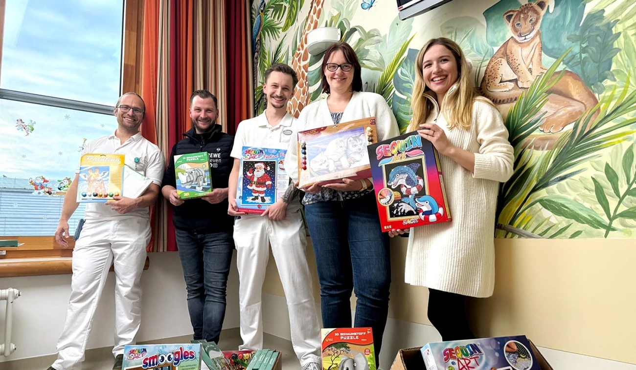 In den Kartons: liebevoll zusammengestellte Bastel- und Malsätze, Puzzle und kreative Beschäftigungsmaterialien, die den Kindern schöne Momente schenken sollen. Auf Station werden wir herzlich begrüßt von Dr. Lars Geerdts (Oberarzt der Klinik für Kinder- und Jugendmedizin), Antje Höhne (Sekretariat) und Lucas Schwarzer (Teamleiter K1). „Eine willkommene Abwechslung für die Kids – wir freuen uns sehr!“, sagt Lucas Schwarzer dankbar beim Öffnen der Kartons. Die MUL – CT war dabei nicht die erste Station auf Stevens Tour: Zuvor besuchte er bereits das Ronald McDonald Elternhaus – und weitere Einrichtungen sollen folgen. Sein Engagement zeigt eindrucksvoll, wie viel bewirkt werden kann, wenn man einfach etwas zurückgeben möchte.