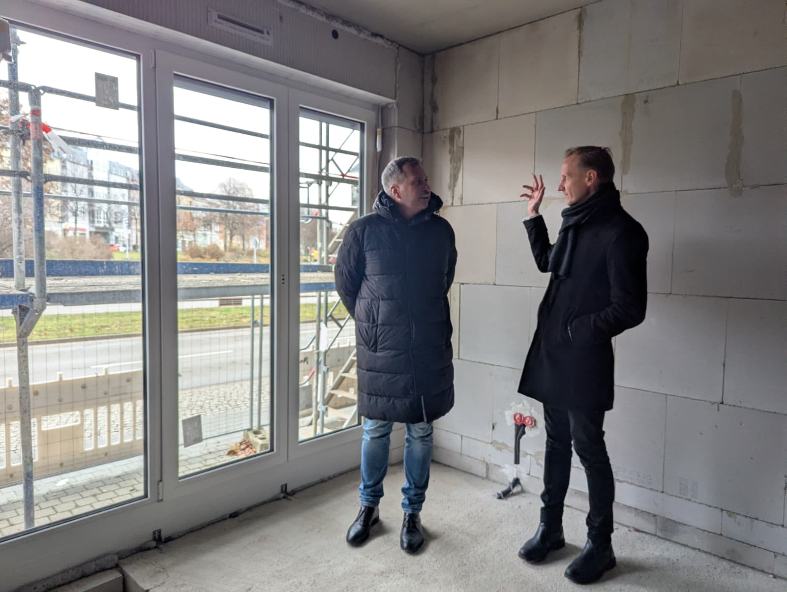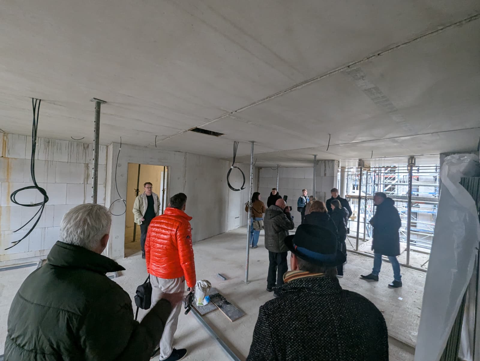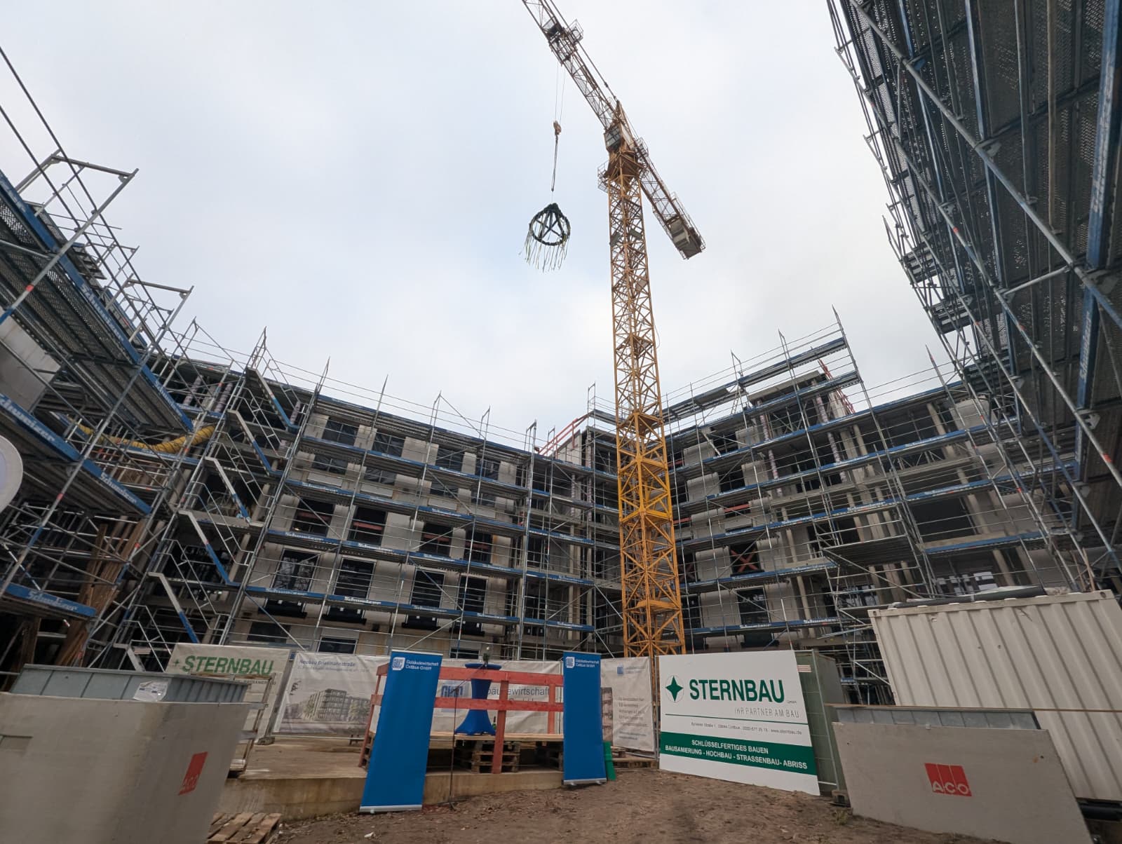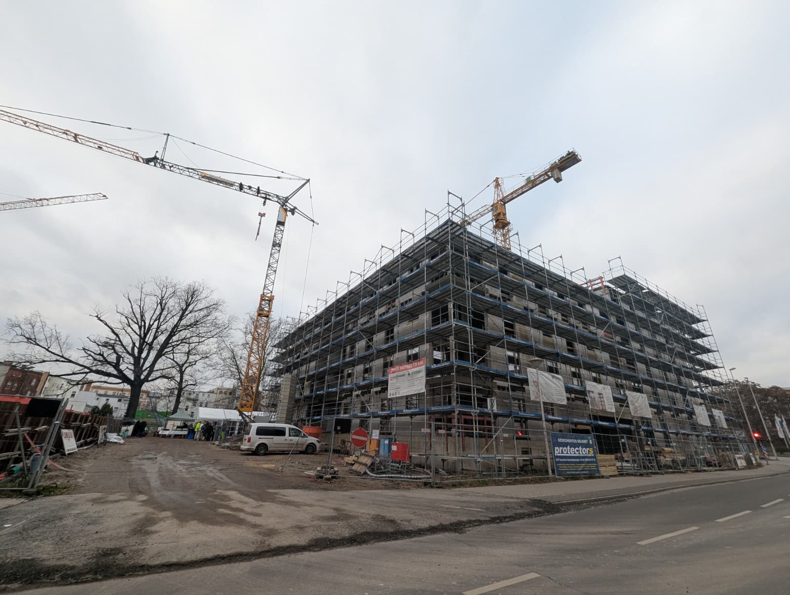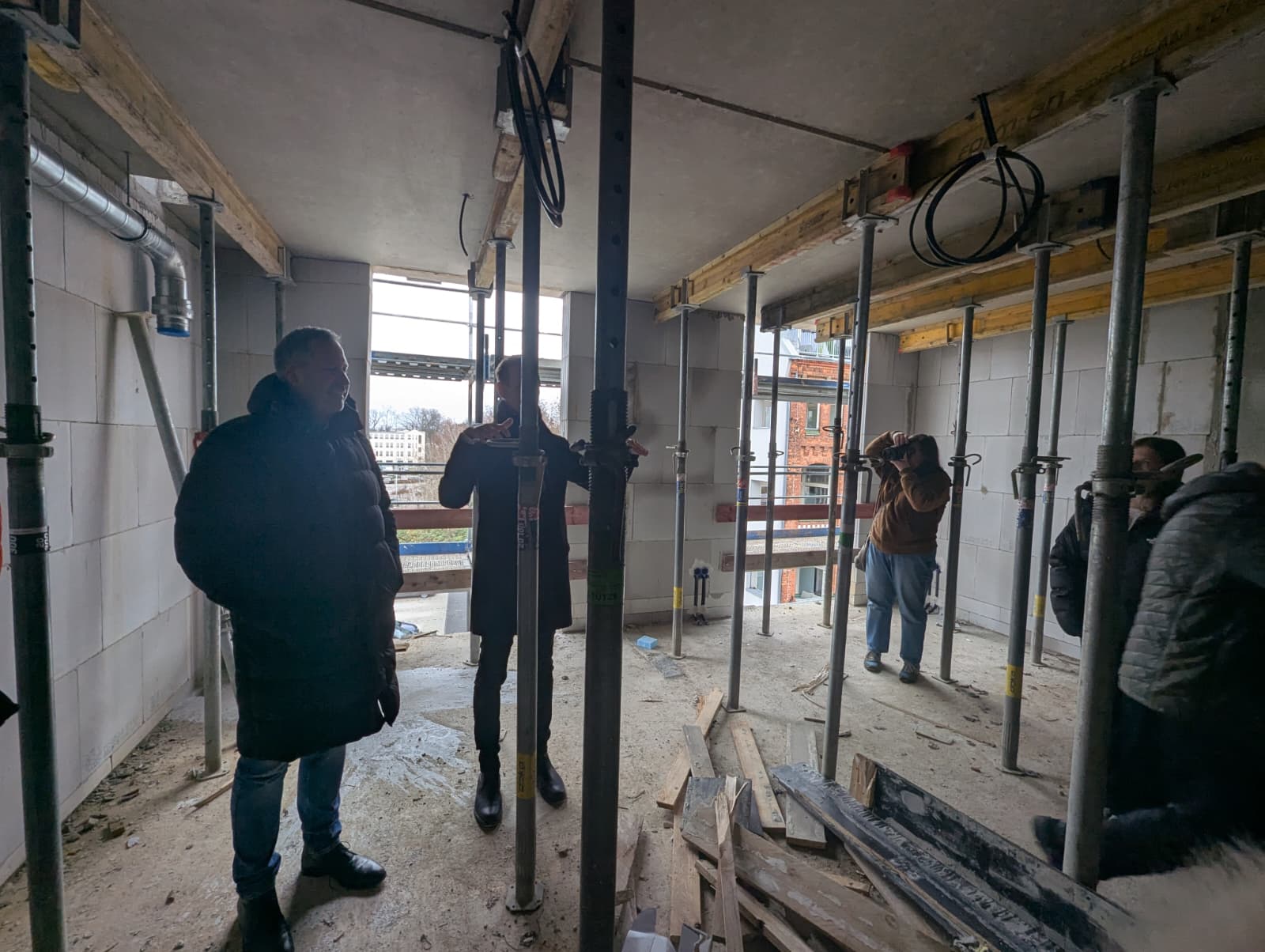 „Alles soweit nach Zeitplan. Wir sind sehr zufrieden und wir sind hier im ersten Bauabschnitt jetzt auf der Zielgeraden“, sagte Herke beim Rundgang über die Baustelle. Das Gebäudevolumen entlang der Franz-Mehring-Straße sei nun deutlich sichtbar. Bereits in etwa einem Monat, also bis Weihnachten, soll der Rohbau vollständig geschlossen sein. „Das heißt, alle Fenster sind dann eingebaut und dann heißt es, Innenausbau für die nächsten sechs bis acht Monate.“