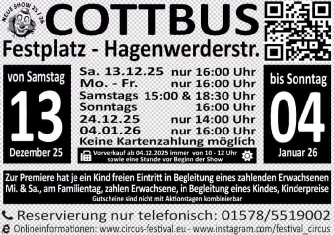 Der Circus verweist zudem auf die positiven Effekte des Sommer-Ferienprojekts (->> wie berichtet), bei dem Kinder aus Cottbus und Umgebung Einblicke in den Alltag des Zirkus erhalten und selbst artistische Übungen ausprobieren konnten. Viele Familien hätten dadurch erstmals zum Winterzirkus gefunden, so Frank. Die Premiere des diesjährigen Cottbuser Weihnachtscircus findet am 13. Dezember statt. Die Vorstellungen laufen bis zum 4. Januar. Der Vorverkauf hat bereits begonnen.