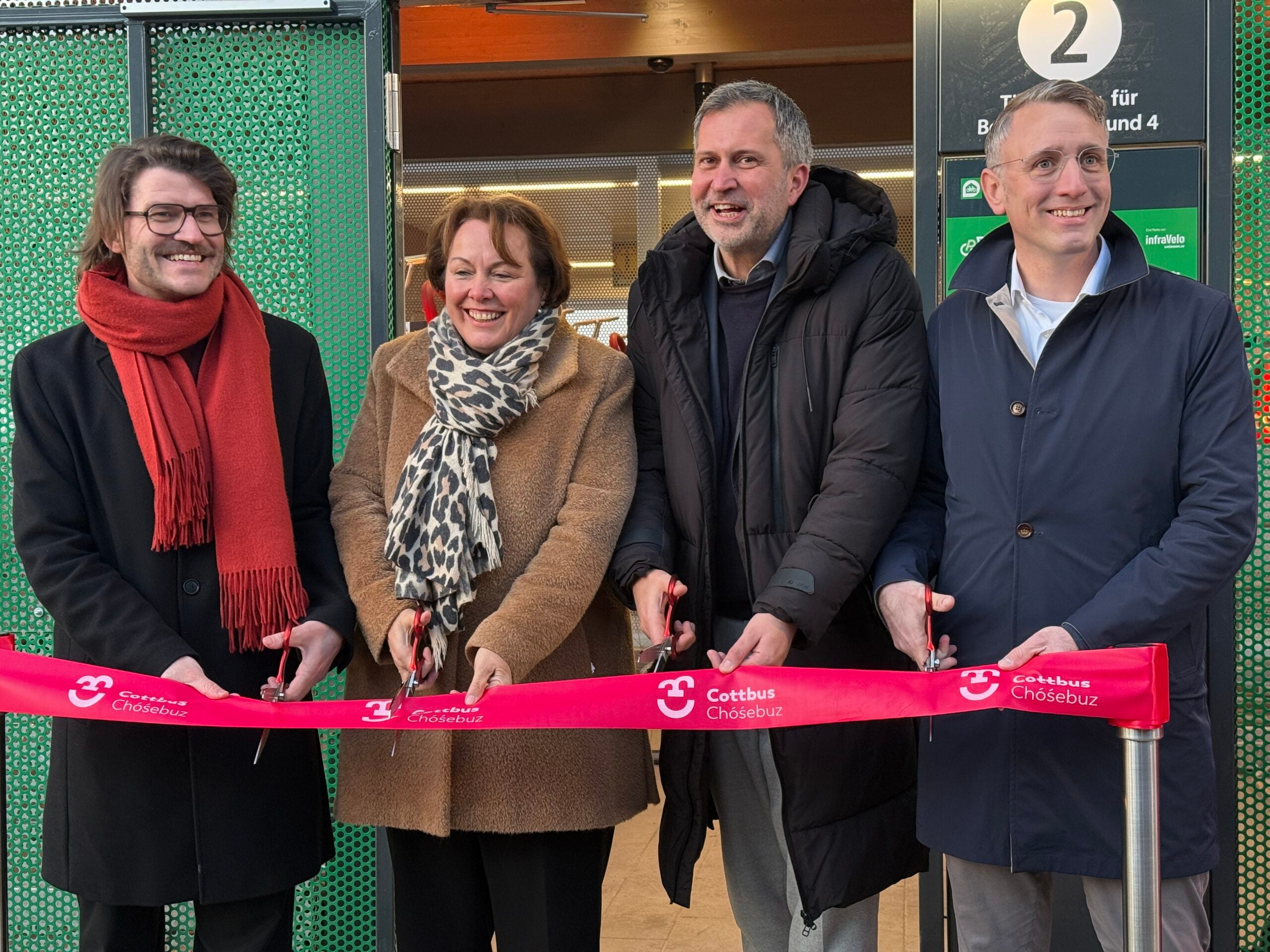 Das neue Fahrradparkhaus an der Südseite des Hauptbahnhofes Cottbus ist offiziell eröffnet worden. An der feierlichen Eröffnung nahmen am heutigen Donnerstagnachmittag Infrastrukturstaatssekretärin Ina Bartmann, der Oberbürgermeister der Stadt Cottbus Tobias Schick, der Geschäftsführer des Verkehrsverbundes Berlin-Brandenburg Christoph Heuing sowie Michael Fugel, Geschäftsführer von infraVelo, teil.