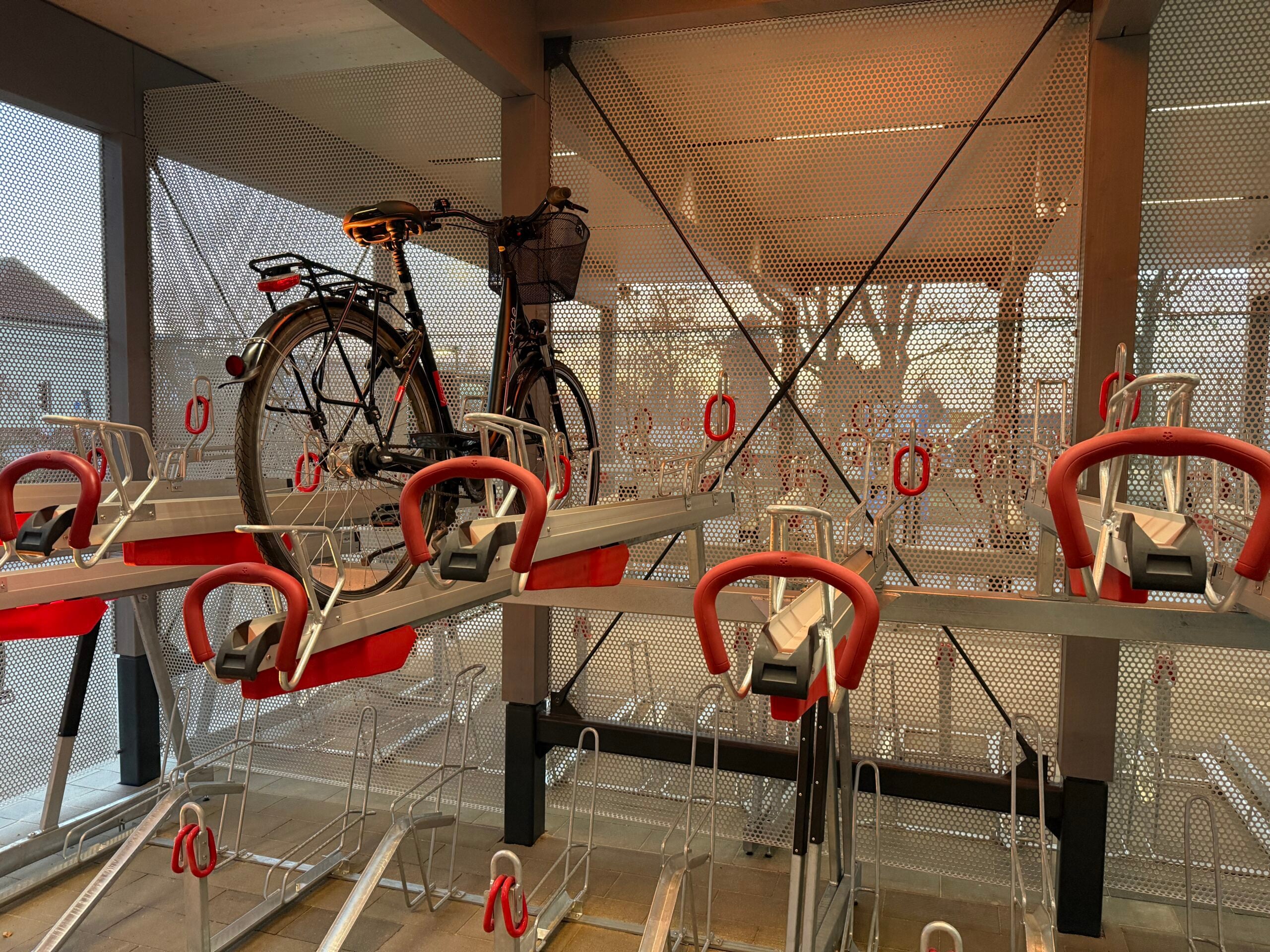 Das Fahrradparkhaus verbindet einen modularen Ansatz mit einer Holzbauweise. Ergänzt wird die Konstruktion durch ein begrüntes Dach sowie Photovoltaikmodule. Die Anlage bietet sowohl frei zugängliche als auch gesicherte Abstellbereiche. Neben klassischen Fahrradständern gibt es ein separates Abteil für Lastenräder.