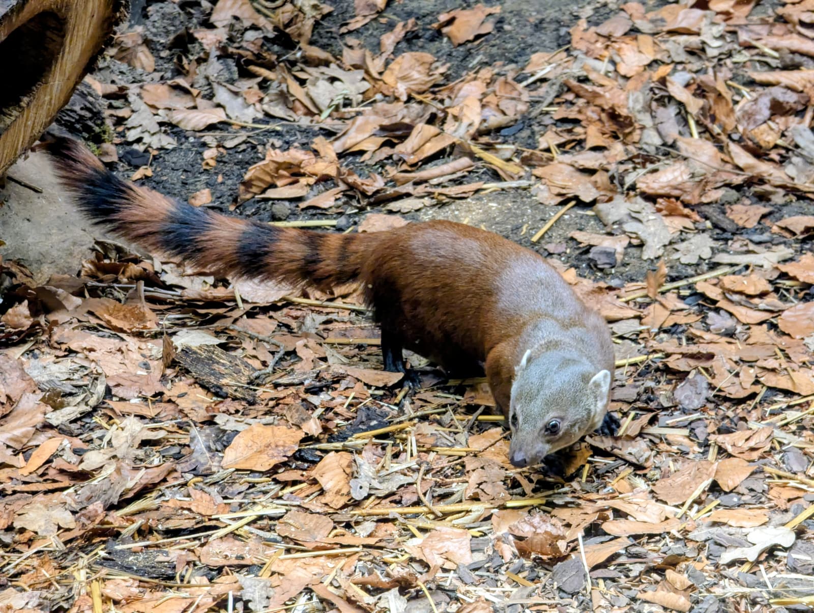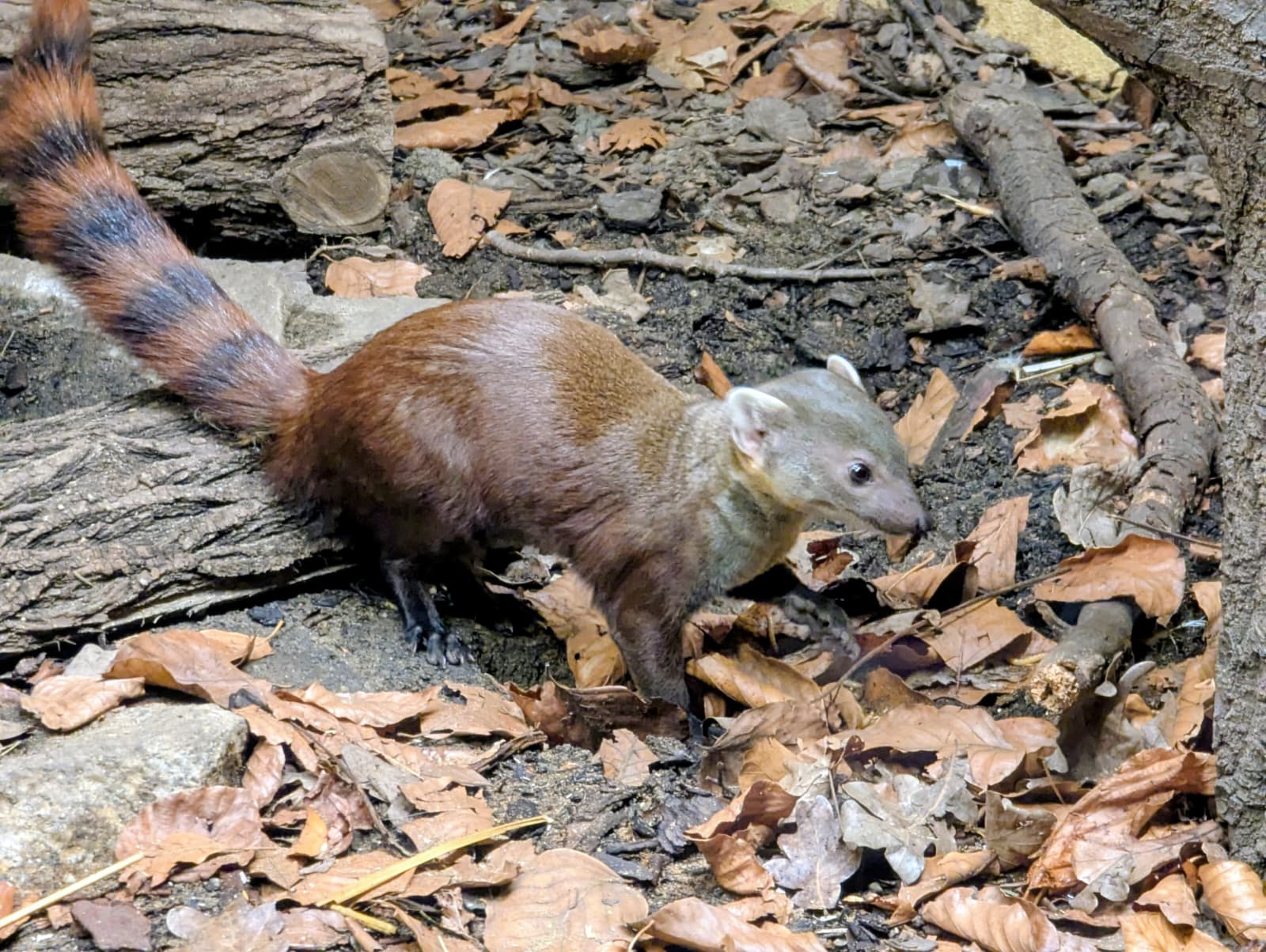 Ringelschwanzmungos zählen zu den Kleinraubtieren und gehören zur Verwandtschaft der Schleichkatzen. Ihr natürliches Verbreitungsgebiet liegt auf Madagaskar. Im Unterschied zu vielen anderen Kleinraubtieren sind sie nahezu ganztägig aktiv und häufig paarweise unterwegs. Die im Tierpark Cottbus gehaltenen Tiere stammen aus Nachzuchten der Zoologischen Gärten in Saarbrücken und Köln.