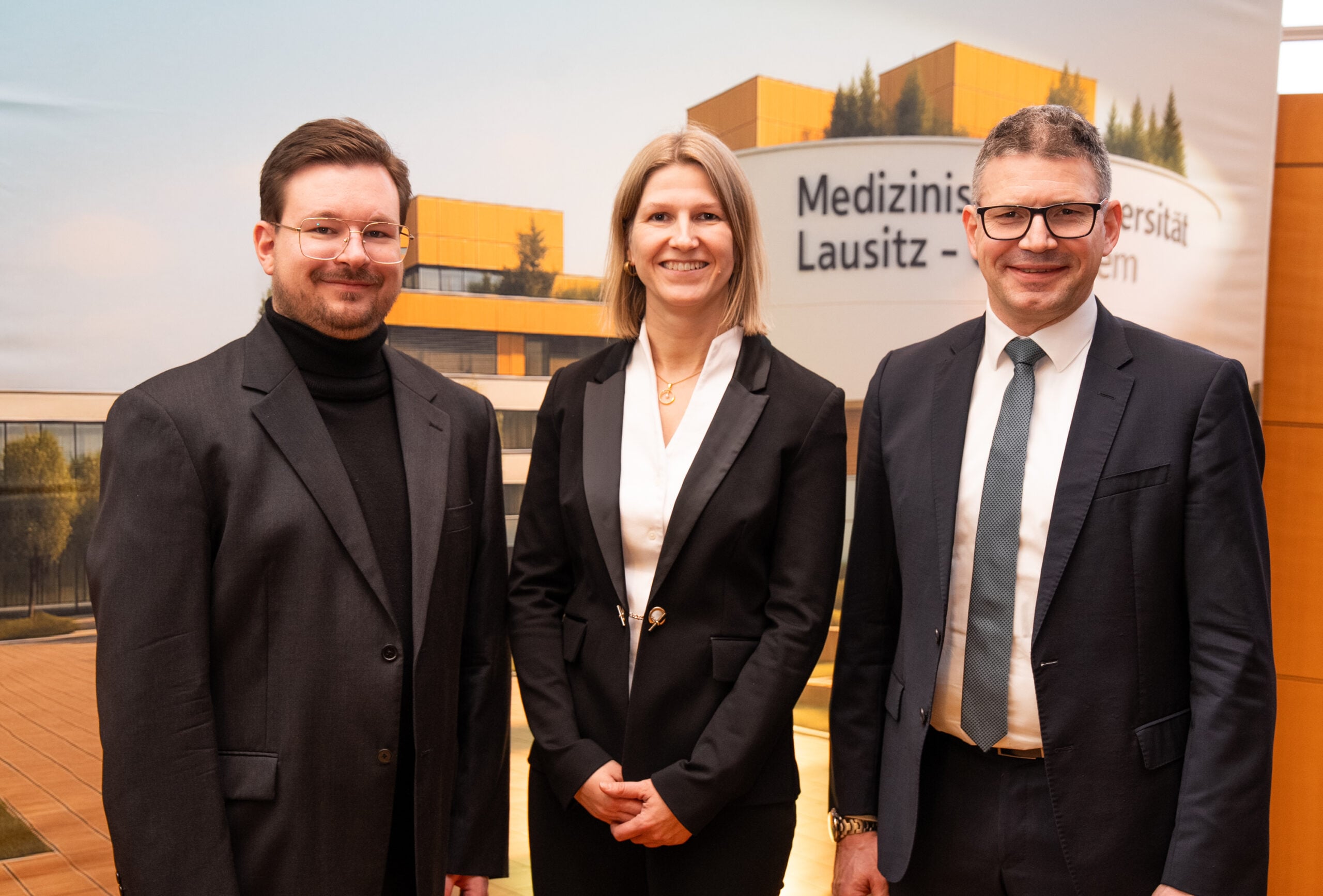 Im Beisein von Brandenburgs Wissenschaftsministerin Dr. Manja Schüle und dem Cottbuser Oberbürgermeister Tobias Schick hat die Medizinische Universität Lausitz – Carl Thiem (MUL – CT) erstmals externe Professorinnen und Professoren berufen. Prof. Dr. Sven Schumann im Fach Anatomie, Prof. Dr. Jeannine Schübel im Fach Allgemeinmedizin sowie Prof. Dr. Uwe Maus im Fach Orthopädie erhielten jeweils eine W3-Professur.