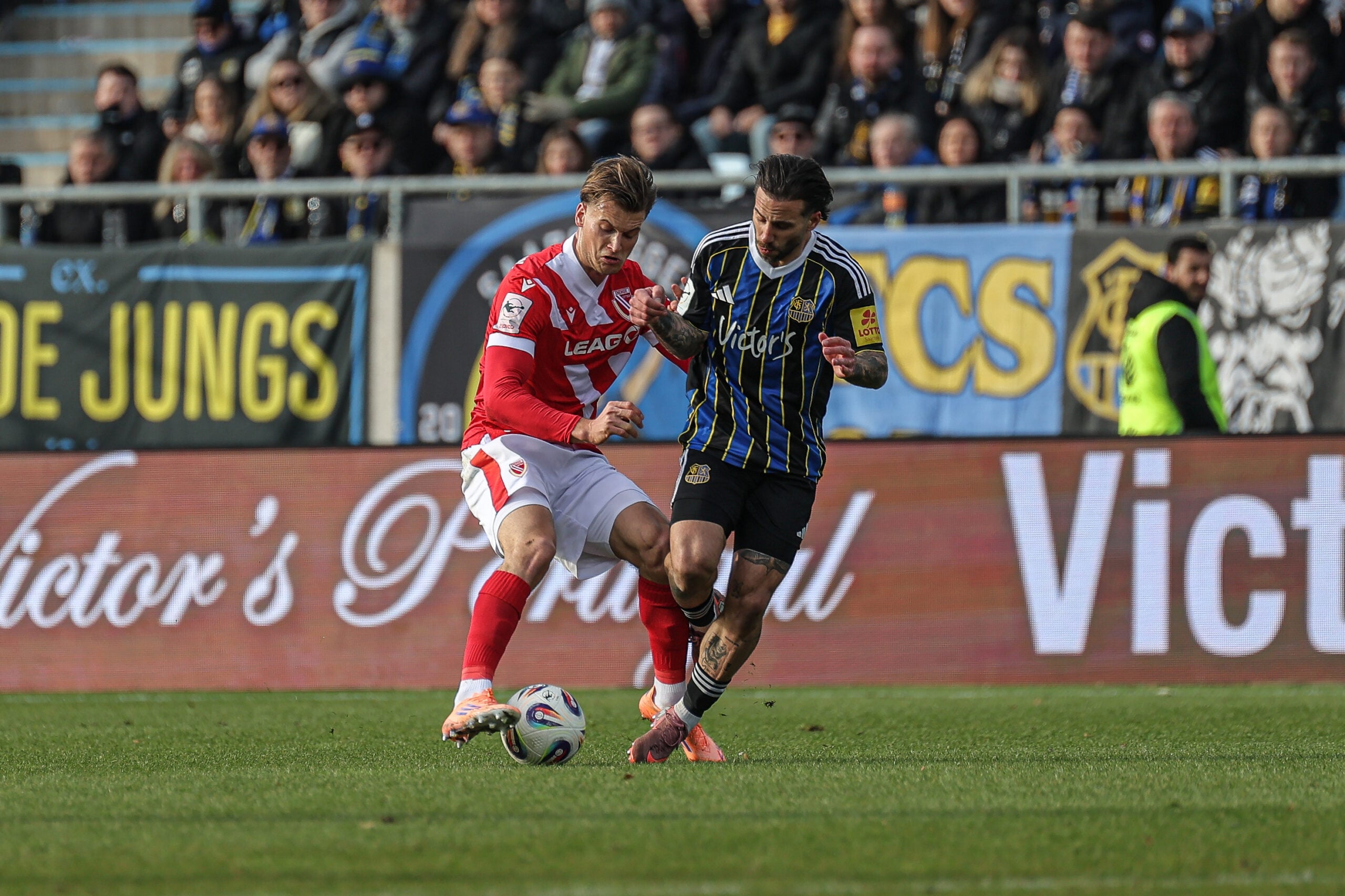 In der Folge entwickelte sich eine offene Phase mit viel Bewegung und schnellen Umschaltmomenten auf beiden Seiten, ohne dass zwingende Torchancen heraussprangen. Saarbrücken blieb dennoch gefährlich. In der 38. Minute kam Kai Brünker nach einer Hereingabe vom rechten Flügel in der Fallbewegung noch zum Abschluss, wurde dabei aber entscheidend von Awortwie-Grant gestört und setzte den Ball deutlich über das Tor.