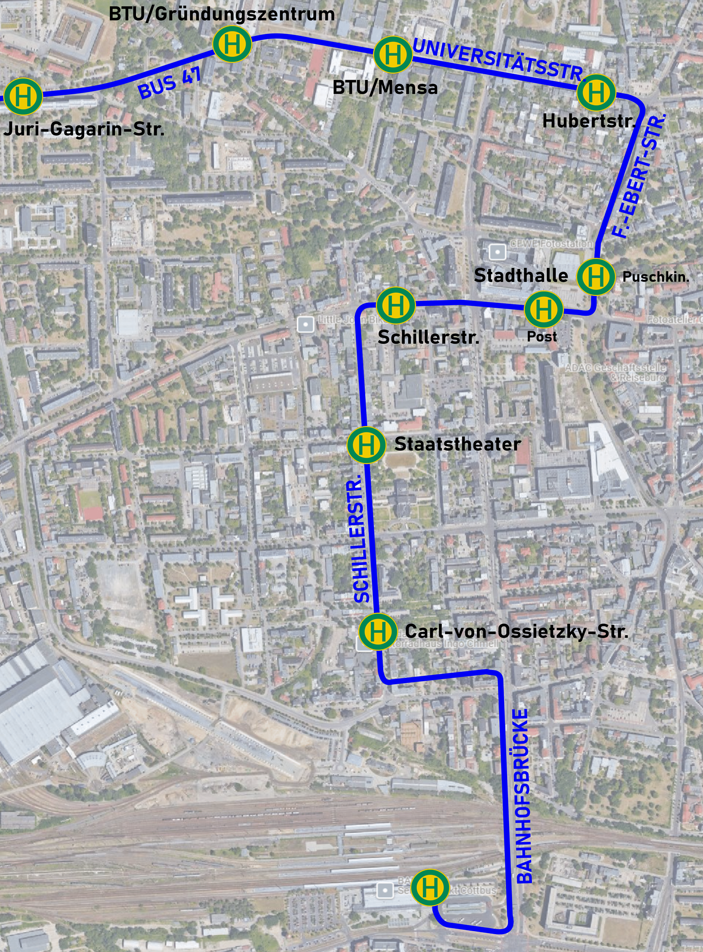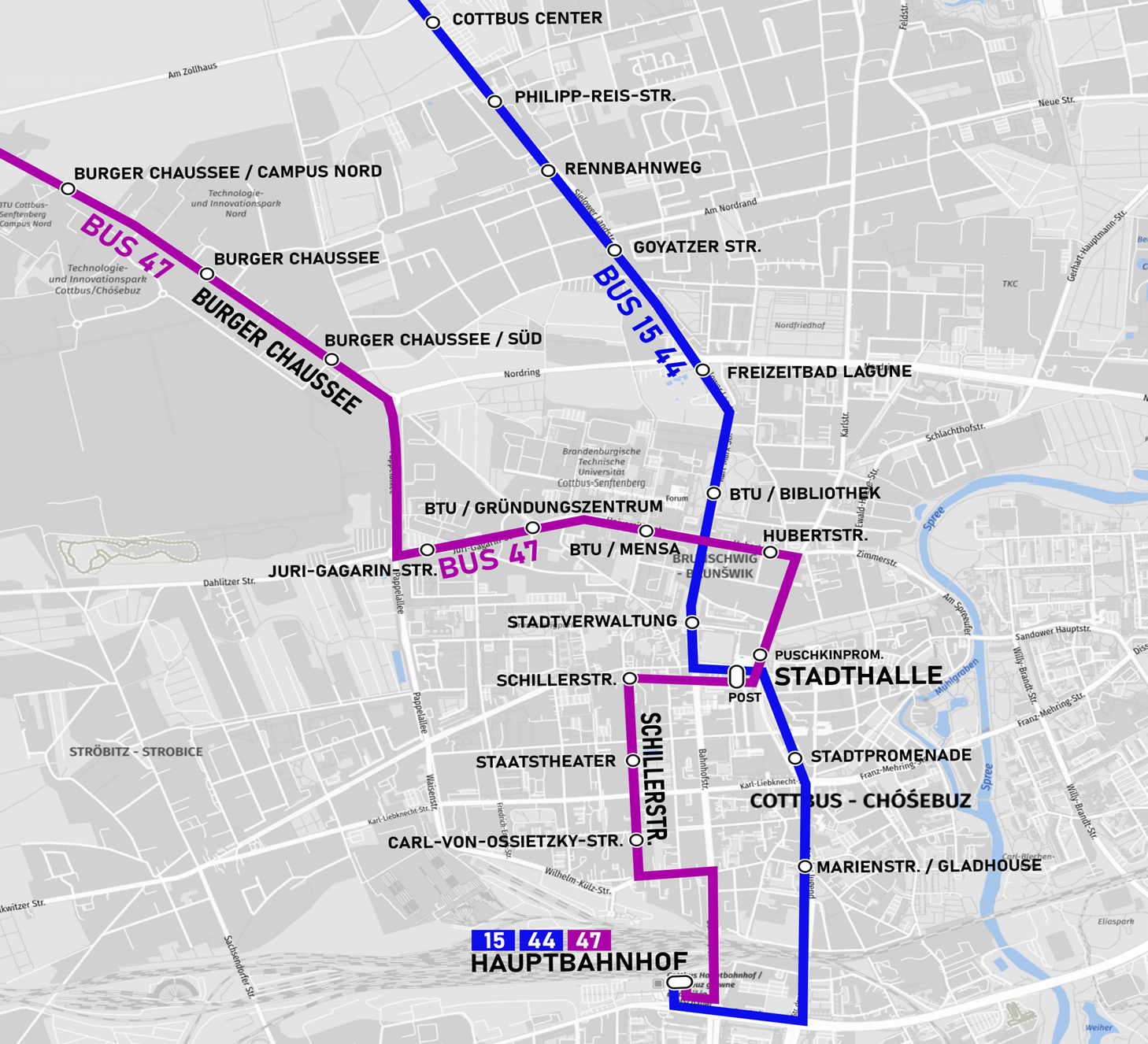 Bei der Linie 47 entfällt die Einzelfahrt um 07:38 Uhr ab der Haltestelle „Burg Schule“. Zudem erhält die Linie im Stadtgebiet Cottbus eine neue Linienführung. Diese verläuft künftig über die Haltestellen „Hauptbahnhof“, „Carl-von-Ossietzky-Straße“, die neu eingerichtete Haltestelle „Staatstheater“, „Schillerstraße“, „Stadthalle Puschkinpromenade“, „Hubertstraße“, „BTU Mensa“, „BTU Gründungszentrum“ sowie „Juri-Gagarin-Straße“.