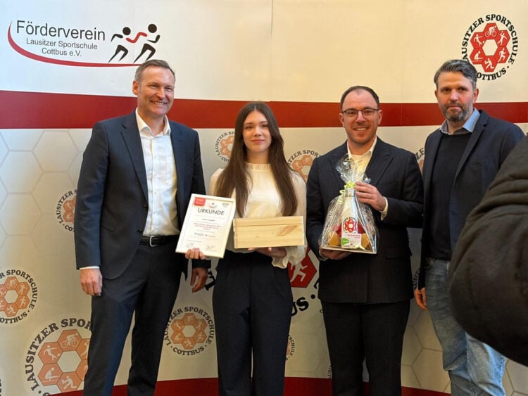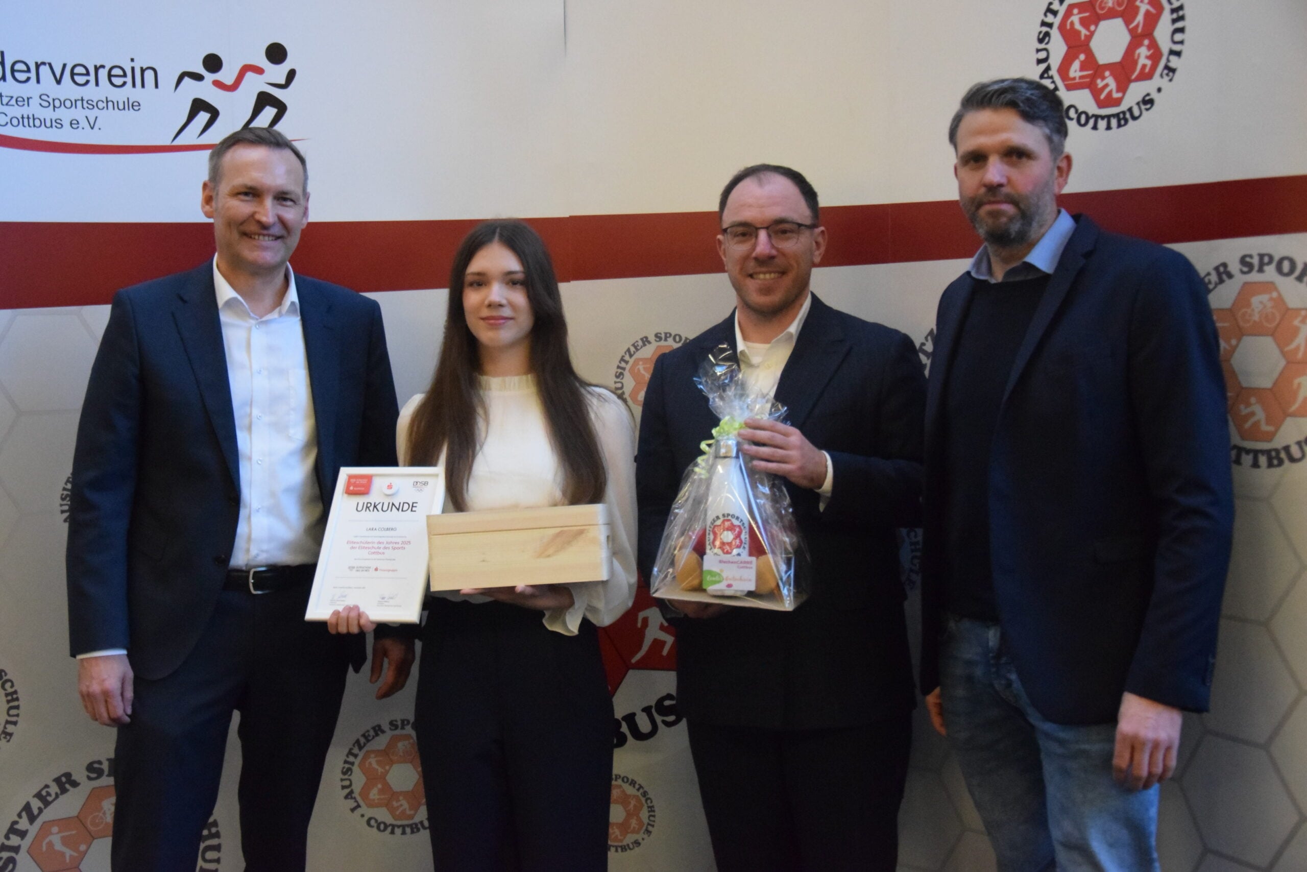 Schulleiter Sten Marquaß nahm die Gelegenheit wahr, an diesem offiziellen Termin vor den künftigen Schülern eine ganz besondere Auszeichnung vorzunehmen. Der Deutsche Olympische Sportbund und die Sparkassen-Finanzgruppe zeichnen seit 2009 in jedem Jahr einen Eliteschüler des Sports aus. Dieser soll für seine besonderen Leistungen belohnt werden um gleichzeitig allen anderen Schüler ein großes Vorbild zu sein. Auf der Ehrentafel, die im Schulgebäude für jeden dieser Ausgezeichneten zu sehen ist, wird nun auch der Name der „Eliteschülerin des Sports 2025” Lara Colberg zu lesen sein. Die Bahnradsportlerin, die aktuell die 11.Klasse besucht, ist im vergangenen Jahr Vizeweltmeisterin und Vizeeuropameisterin der Junioren geworden. Eine goldene Medaille strebt sie im Juli 2026 an. Dann findet zum zweiten Mal auf dem Cottbuser Velodrom eine Bahnradsport-Europameisterschaft für die Altersklassen U19 und U23 statt. Auf dem ihr bestens bekannten Oval will Lara dann die erste überregionale Goldmedaille herausfahren. Um mit diesem Erfolg ein Vorbild für jene jungen Sportler zu sein, die kurz vor den Ferien ihre Empfehlungsurkunden für die Lausitzer Sportschule erhalten haben.