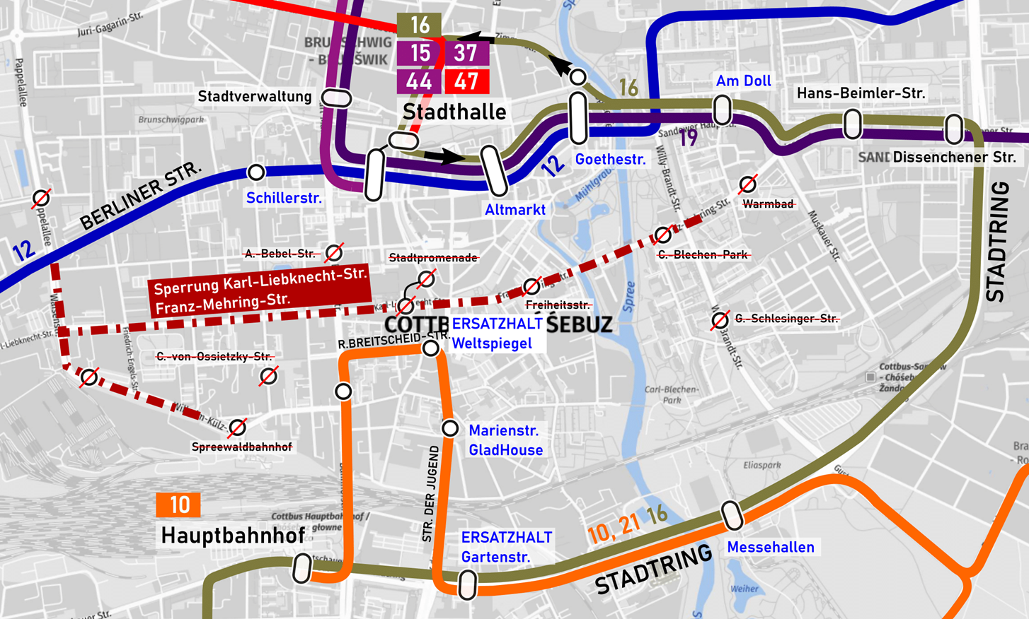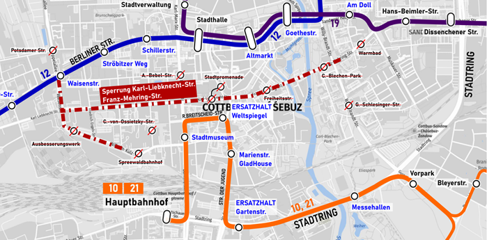 Die Linie 12 fährt im genannten Zeitraum zunächst regulär von Kolkwitz bis zum Kornblumenweg. Anschließend wird sie über die Haltestellen „Ströbitzer Hauptstraße“, „Schillerstraße“, „Stadthalle Post“, „Altmarkt“ und „Goethestraße“ bis zur „Hermannstraße“ umgeleitet und setzt danach ihren regulären Linienweg fort.