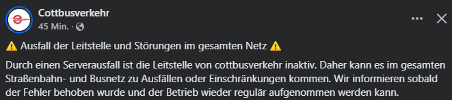 Update 11:45 Uhr: Cottbusverkehr hat die Mitteilung mittlerweile von der Facebookseite gelöscht. Ob der Fehler vollständig behoben werden konnte, ist noch nicht bekannt.