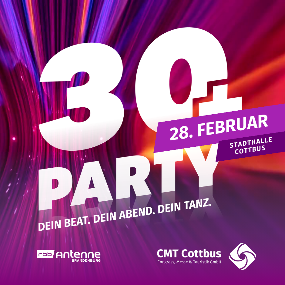 Wenn am 28. Februar die Türen der Stadthalle Cottbus aufgehen, gehört die Tanzfläche wieder dem 30+ Publikum. Ab 20:00 Uhr startet dort die erste 30+ Party des Jahres 2026. Drei Floors mit unterschiedlichen Musikrichtungen sorgen für Abwechslung an einem Abend, der ganz auf gemeinsames Feiern ausgelegt ist. Wie der Veranstalter mitteilt, folgen im Laufe des Jahres drei weitere Termine.