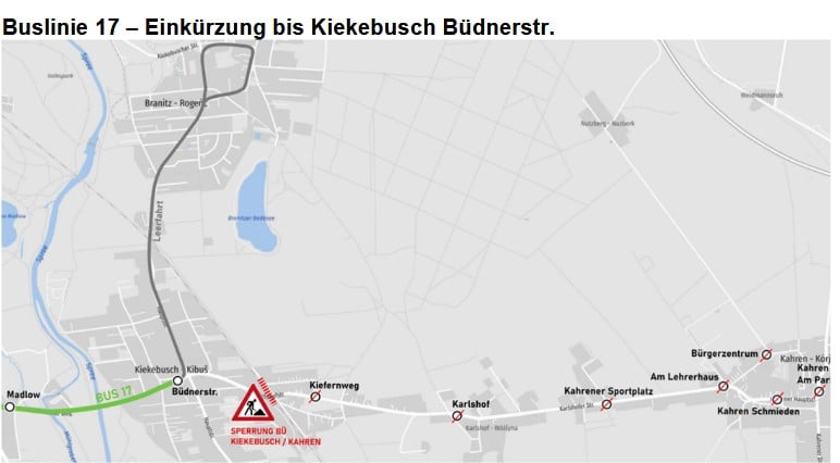 Für den Kraftverkehr sind entsprechende Umleitungen ausgeschildert. Während der Sperrung in Richtung Branitz erfolgt die Umleitung über den Stadtring, die Straße der Jugend, die Dresdener Straße sowie die Madlower Hauptstraße. In Richtung Kahren führt die Umleitung über Frauendorf und Koppatz. Zu beachten ist, dass der Bahnübergang zwischen Frauendorf und Koppatz ebenfalls zeitweise gesperrt ist, jedoch nicht parallel zur Sperrung nach Kahren.