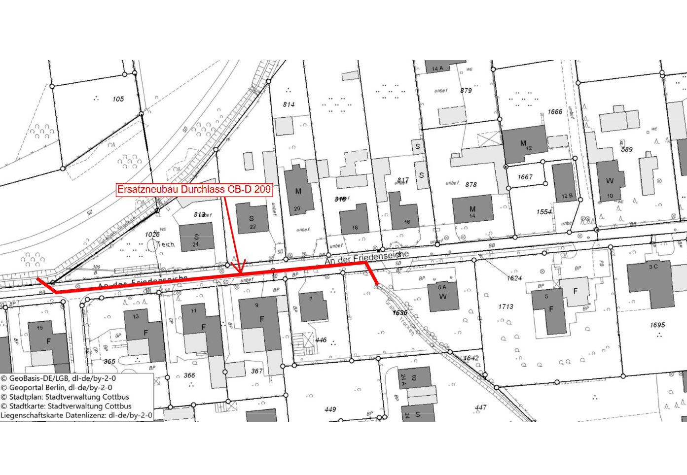 Wie die Stadt Cottbus mitteilt, starten am 16. März 2026 Bauarbeiten in der Straße An der Friedenseiche im Ortsteil Branitz. Betroffen ist der Abschnitt vor den Grundstücken 5A, 7, 9, 11, 13, 16, 18, 20, 22 und 24. Auf einer Länge von etwa 120 Metern erfolgt der Ersatzneubau des Durchlasses CB-D 209.