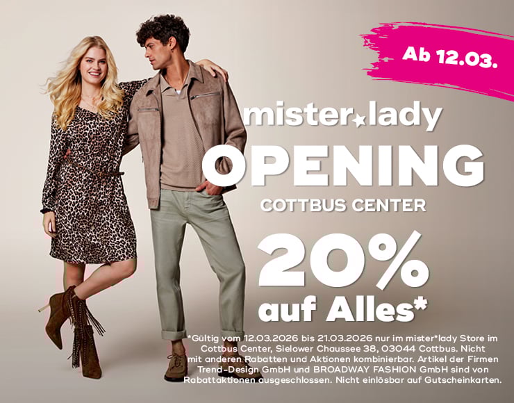 Zum Start des neuen Geschäfts kündigt mister*lady eine Eröffnungsaktion an. Vom 12. März bis zum 21. März 2026 erhalten Kundinnen und Kunden im neuen Store einen Preisnachlass von 20 Prozent auf das Sortiment. Das Angebot gilt nach Unternehmensangaben ausschließlich im mister*lady Store im Cottbus Center an der Sielower Chaussee und kann nicht mit anderen Rabatten oder Aktionen kombiniert werden.