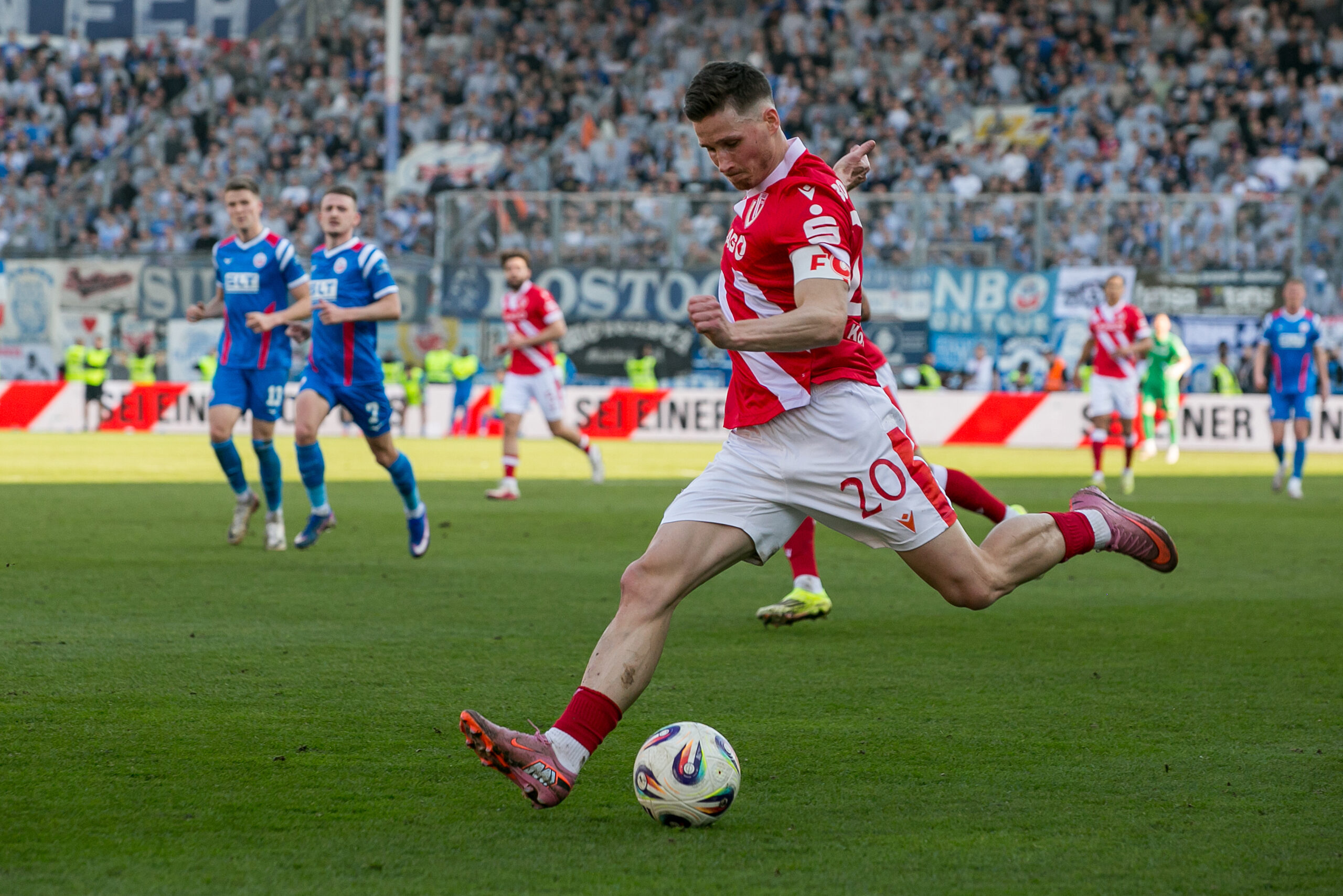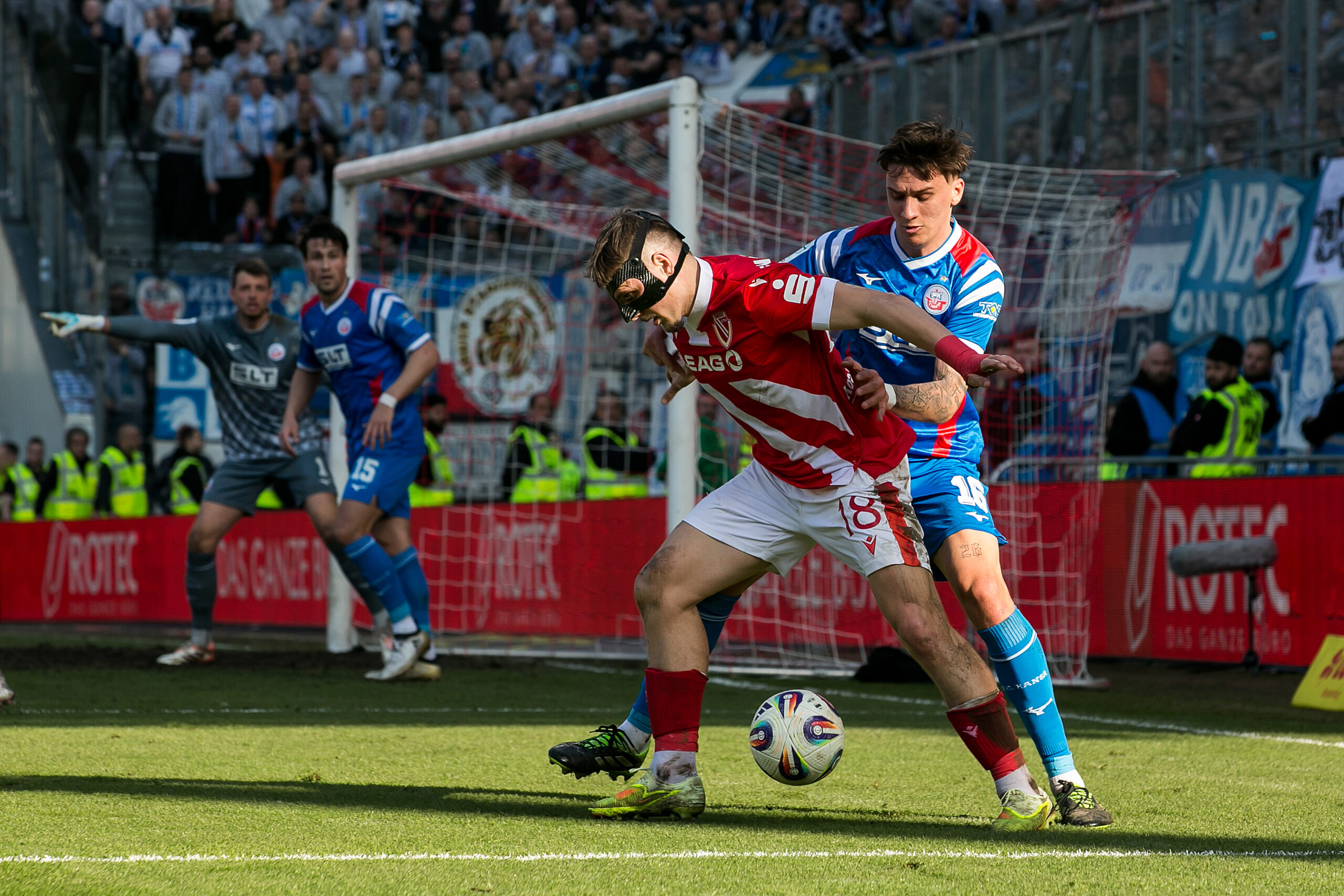 Auch mit der zunehmenden Cottbuser Spielkontrolle blieb Rostock gefährlich. In der 34. Minute entkam Maximilian Krauß der Cottbuser Defensive und tauchte beinahe frei vor Marius Funk auf. Der Rostocker zögerte jedoch im entscheidenden Moment, sodass die Cottbuser Hintermannschaft die Situation soeben noch klären konnte. So entwickelte sich eine unterhaltsame erste Hälfte mit Chancen auf beiden Seiten, jedoch ohne Torerfolg. Mit einem 0:0 geht es in die Halbzeitpause. Die Partie bleibt völlig offen.