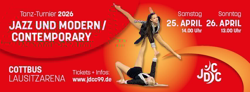 Am kommenden Wochenende rückt die LausitzArena in Cottbus in den Fokus des Tanzsports. Am 25. und 26. April 2026 treffen hier Formationen aus dem Ligabereich Nord/Ost im Jazz und Modern/Contemporary aufeinander. Von den jüngsten Tänzerinnen bis hin zu erfahrenen Teams sind mehrere Alters- und Leistungsklassen vertreten. Ergänzt werden die Wettkämpfe durch ein Showprogramm mit weiteren Gruppen. Karten für beide Tage sind bereits im Vorverkauf erhältlich. Tickets und Infos ->> Hier entlang.