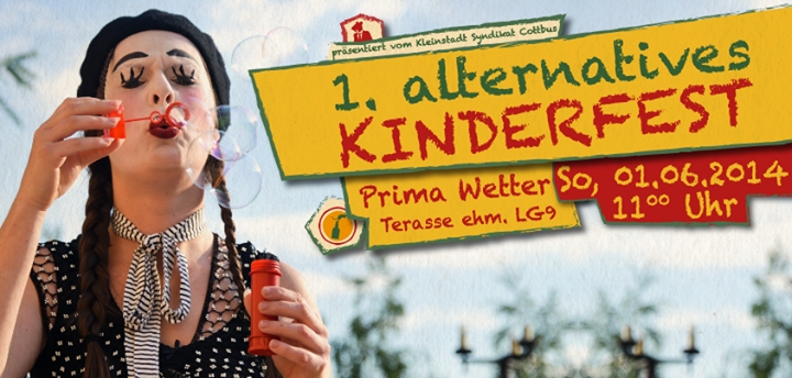 Zum Kindertag am 01. Juni 2014 lädt das „Kleinstadt Syndikat“ alle Familien, große und kleine Menschen zum Kinderfest in den Stadtstrand „Prima Wetter“ ein. Ab 11 Uhr gibt es Spiel, Spaß, Musik und gesunde Leckereien für alle. Mit dabei sind auch Stullinchen Knäcke, das Humanistische Jugendwerk Cottbus e.V., Siggi Sorglos, das Seitenquiz und viele andere Schabernacktreibende.
