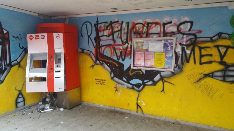 Durch unbekannte Täter wurde am Mittwoch gegen 01:00 Uhr der Fahrkartenautomat an der Endhaltestelle der Straßenbahn Linie 4 in Cottbus – Sachsendorf gesprengt. Es war bereits das zweite Mal, dass dieser Automat gesprengt wurde, bereits im Februar 2015 wurde der Vorgänger so unbrauchbar gemacht. Diverse Automatenteile wurden mehrere Meter weit geschleudert. Durch Zeugen wurden zwei Männer beobachtet, wie sie kurz davor den Tatort aufsuchten. Wenig später kam es zur Explosion. Bei der Sprengung wurde der Automat erheblich beschädigt. Nach ersten Ermittlungen wurde daraus die Geldkassette mit einer unbekannten Summe an Bargeld gestohlen. Die Gesamtschadenshöhe beträgt laut Cottbusverkehr etwa 35.000 Euro. „Noch ist nicht klar ob die Versicherung dafür einspringt, da es ein Wiederholungsfall ist und ob der Automat nochmal neu augestellt wird.“ so Unternehmenssprecherin Christin Heldt.