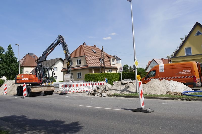 Ebenfalls erneuert wird altersbedingt ein Regenwasserkanal aus Beton. Auch hier kommen nun moderne Kunststoffrohre zum Einsatz. „Da dieser Regenwasserkanal die Pyramidenstraße in Höhe Bleyer-Straße quert, musste die Straße halbseitig gesperrt und eine Ampel aufgestellt werden“, erläutert Marten Eger. „Bis Ende Juni werden wir jedoch die Arbeiten beenden und dann unsererseits die Straße wieder freigeben.“