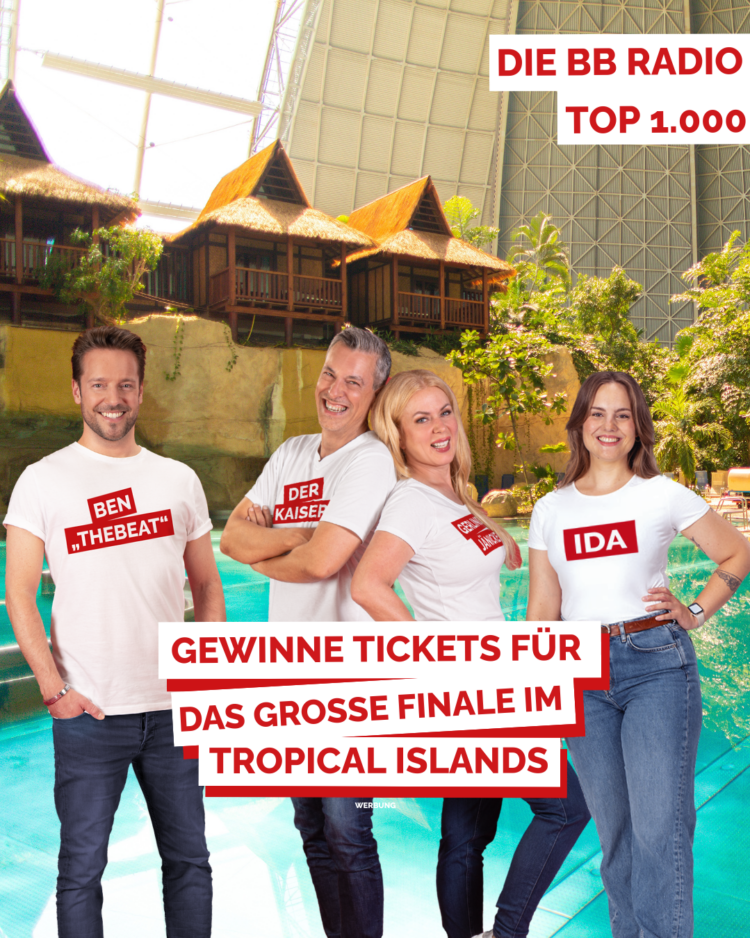 Zum Frauentag verwandelt sich die Tropenhalle in eine Chart-Location mit Strandkulisse. Beim großen Finale der BB RADIO TOP 1.000 werden die letzten 150 Songs der von Hörerinnen und Hörern gewählten Playlist gespielt. Mit dabei sind „Der Kaiser“ und Gerlinde Jänicke sowie Ida und Ben TheBeat. Sie moderieren live vom Strand und feiern jede einzelne Platzierung gemeinsam mit dem Publikum. Sand, Palmen und Musik sorgen dabei für echtes Urlaubsgefühl. Bereits am Donnerstag, startet die Aktion im Radioprogramm. Vier Tage lang läuft die längste Playlist Brandenburgs und Berlins rund um die Uhr. Moderiert wird nonstop bis zum großen Finale am Sonntagabend im Tropical Islands.