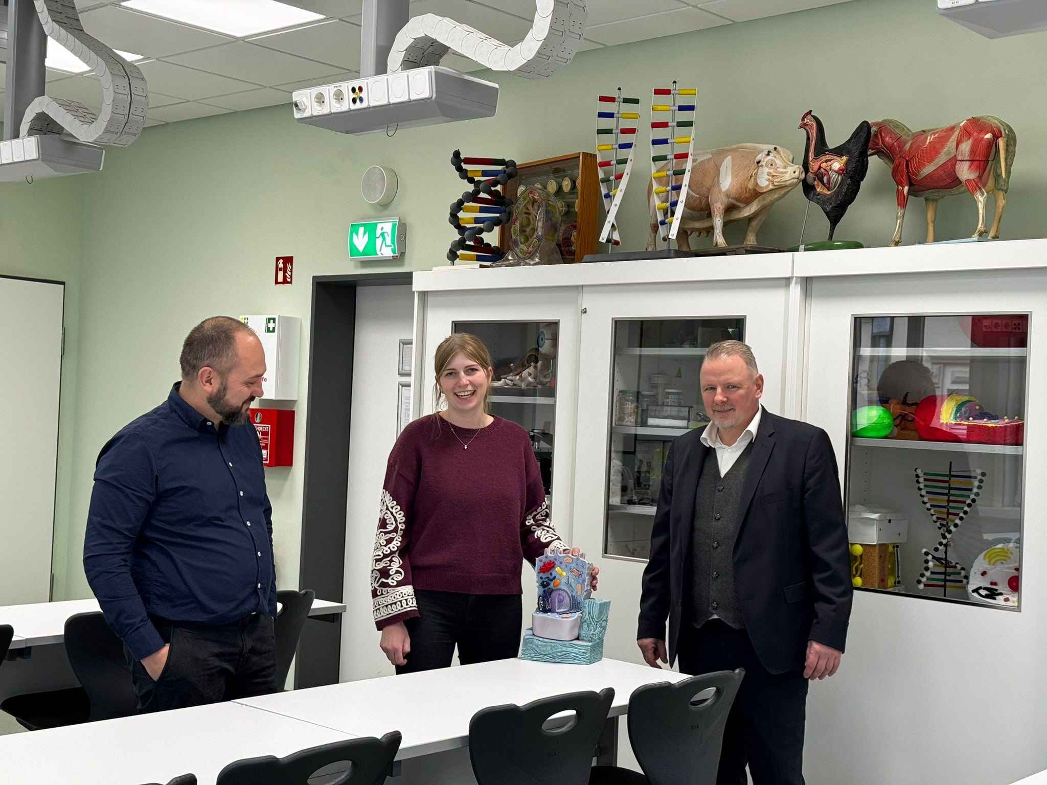 Foto: Schulleiter Peter Guhra und Dahme-Spreewalds Finanz- und Bildungsdezernent Stefan Klein mit Caroline Bergmüller (Lehrkraft für Bio und Chemie).; Quelle: LDS/Nadine Starke