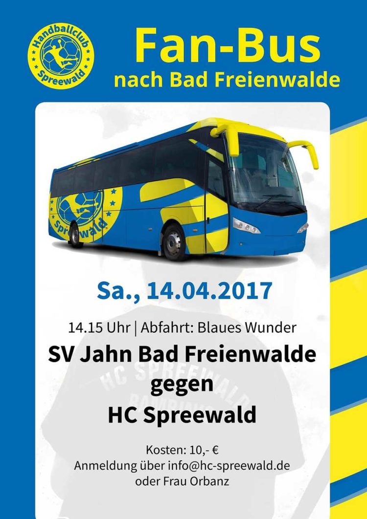 Für das Auswärtsspiel des HC Spreewald in Bad Freienwalde gibt es einen Fanbus. Start ist am Samstag 14.04.2018 um 14:15 Uhr am Blauen Wunder.