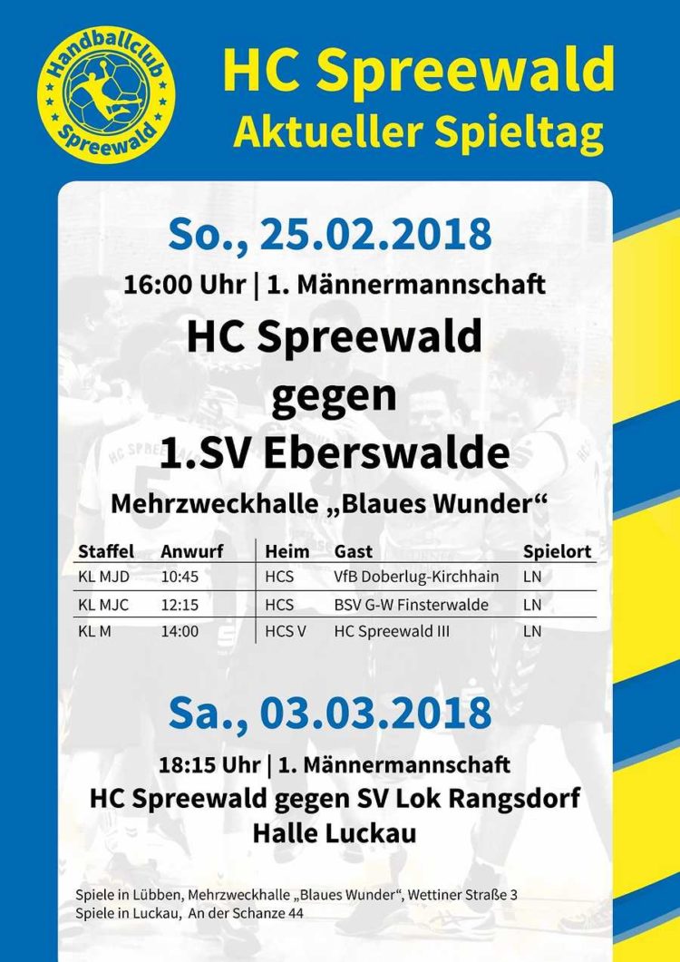Am Sonntag spielt ab 10:45 Uhr die D-Jugend des HC Spreewald gegen VfB Doberlug-Kirchhain, darauf die C-Jugend gegen BSV G-W Finsterwalde. Ab 14.00 Uhr kommt es zum Vereinsderby. Die IV spielt gegen die III. DERBYTIME!