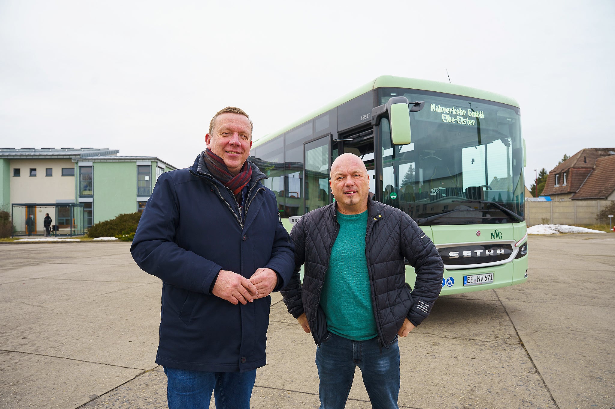 Auf dem Betriebshof in Finsterwalde präsentierten Landrat Christian Jaschinski und Geschäftsführer Mario Vogel die neuen Fahrzeuge der Nahverkehr GmbH Elbe-Elster. Künftig werden die Busse im gesamten Landkreis eingesetzt. Nach Angaben des Landkreises erfolgte die Beschaffung im Rahmen einer europaweiten Ausschreibung.
