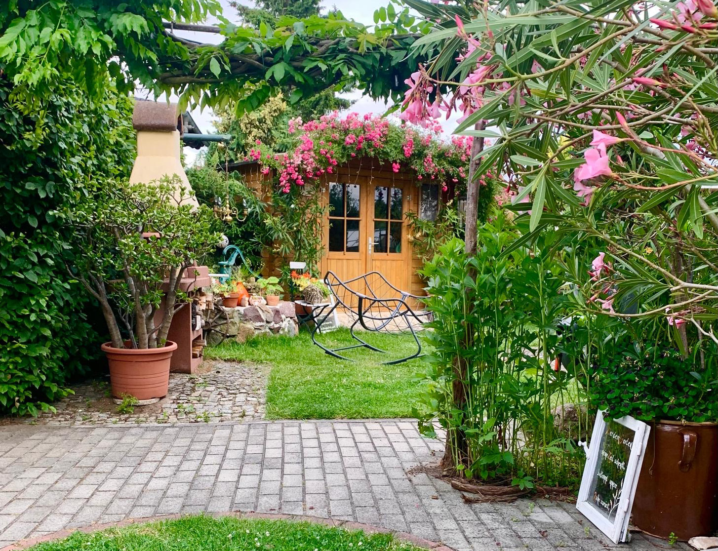 Blühendes Gartenparadies mit dichter Bepflanzung im Vordergrund und einer Laube im Hintergrund – ein stimmungsvoller Einblick in die Vielfalt privater Gartenkultur im Elbe-Elster-Land. (Bild: Carola Salzer)
