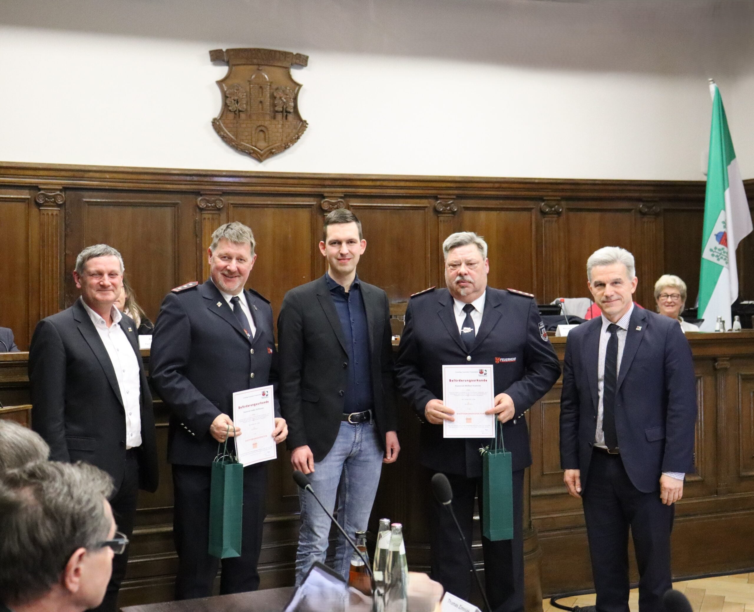 Die Stadt Finsterwalde gratulierte Michael Kamenz und Andy Hoffmann herzlich zur Ernennung zum Hauptbrandinspektor. Glückwünsche, die Ernennungsurkunden sowie der ausdrückliche Dank wurden durch den ersten Stellvertreter des Vorsitzenden der Stadtverordnetenversammlung, Dominic Hake, Bürgermeister Jörg Gampe sowie den Fachbereichsleiter Michael Miersch übermittelt.