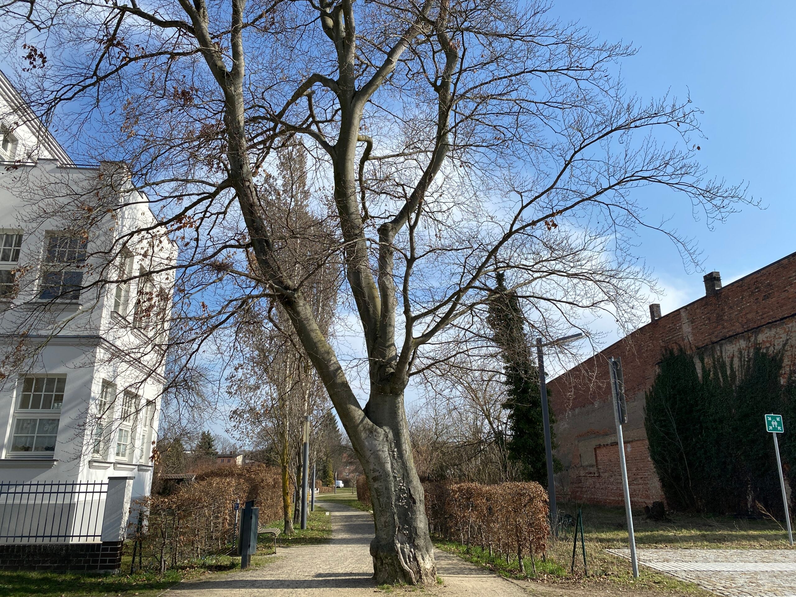 Eine Blutbuche am Eingang des Grünzugs an der Oscar-Kjellberg-Straße in Finsterwalde muss aus Sicherheitsgründen gefällt werden. Wie die Stadt Finsterwalde mitteilt, hat sich im Stamm ein holzzersetzender Pilz ausgebreitet, der die Stabilität des Baumes erheblich beeinträchtigt.
