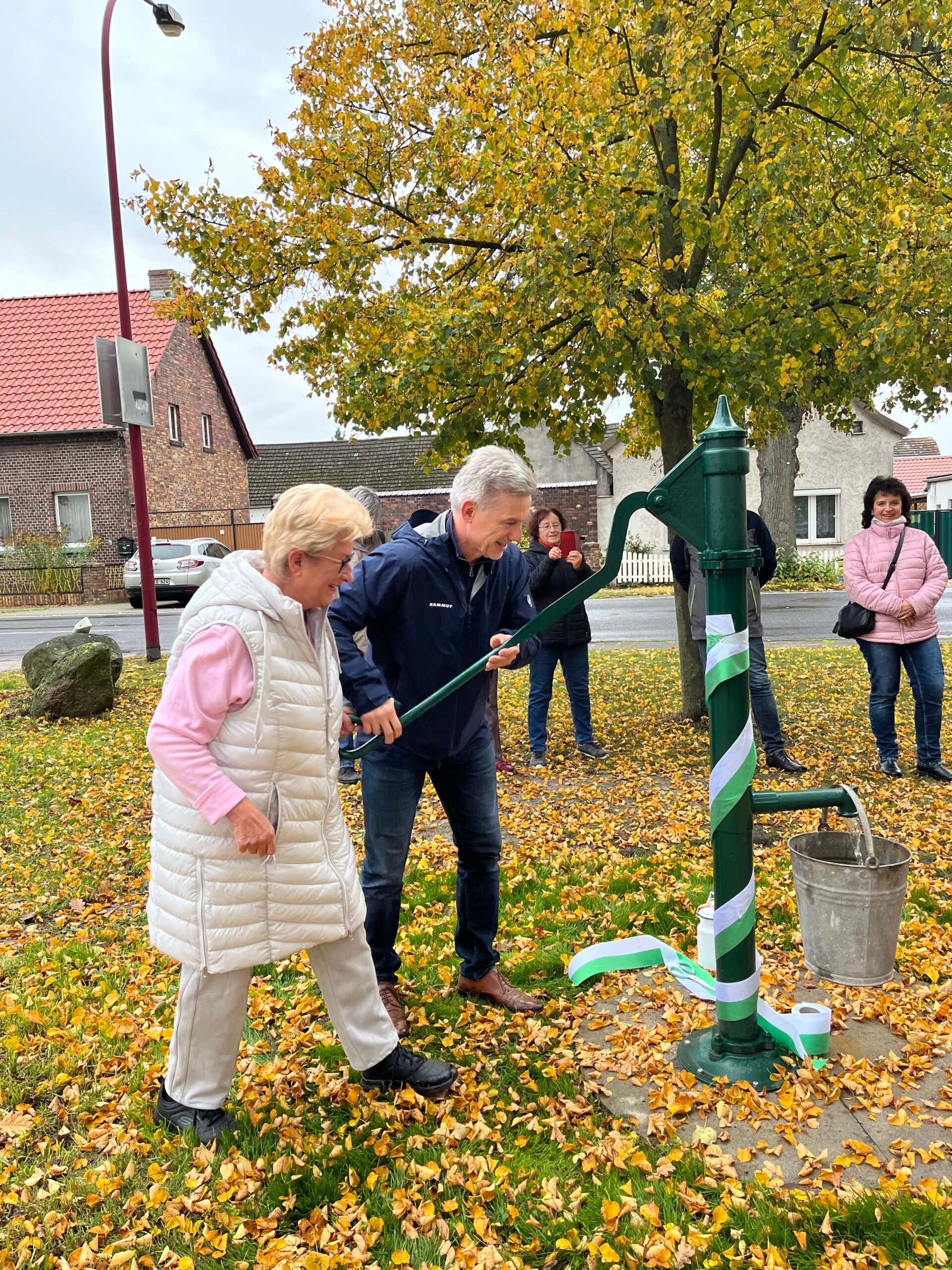 Am Donnerstag, dem 16. Oktober, wurden in Sorno die neue Schwengelpumpe und die Milchbank auf der Dorfaue feierlich eingeweiht. Bei herbstlichem Wetter versammelten sich zahlreiche Einwohnerinnen und Einwohner, um den Abschluss des Projekts zu feiern. Sven Guntermann, Leiter der Lokalen Aktionsgruppe (LAG) Elbe-Elster, und Bürgermeister Jörg Gampe würdigten das große Engagement der Sornoerinnen und Sornoer, die das Vorhaben unter Leitung von Ortsvorsteherin Elvira Vogel mit viel Einsatz umsetzten. Bereits im Herbst 2023 hatten sich interessierte Bürgerinnen und Bürger zu einer Ideensammlung zur Verschönerung der Dorfaue getroffen. Nach mehreren Abstimmungen mit der Stadtverwaltung, der Straßenmeisterei und der LAG Elbe-Elster wurden erste Projekte festgelegt und zur Förderung eingereicht.