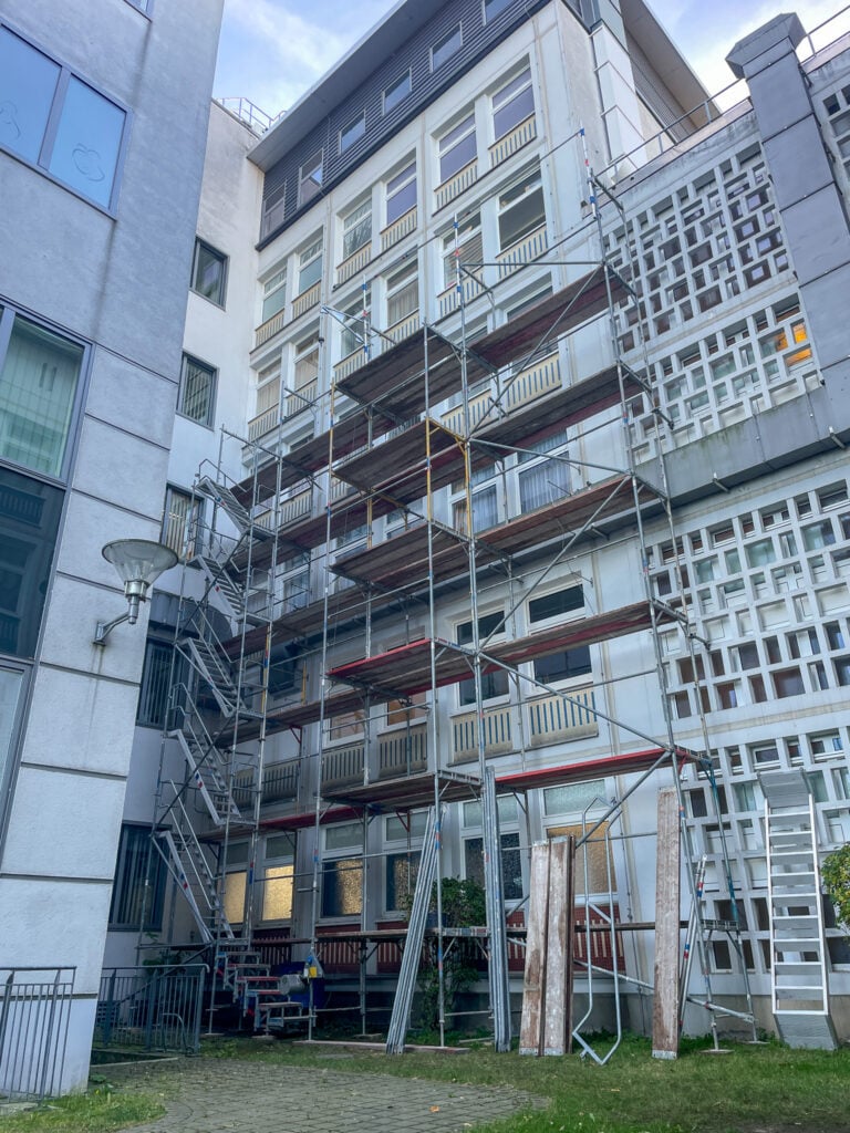 Eine besondere Herausforderung stellt die Durchführung der Arbeiten bei weiterhin laufendem OP-Betrieb dar. Deshalb stehen die Bauverantwortlichen in engem Austausch mit der Krankenhaushygiene und dem Gesundheitsamt. Um die Sicherheits- und Hygienestandards einzuhalten, wird in den kommenden Tagen ein externer Baustellenzugang über die Außenwand eingerichtet. Dazu entstehen im Innenhof zwischen Ärztehaus und U+B-Gebäude ein Gerüst mit Treppen und ein Lastenaufzug. Anschließend wird eine hermetische Abdichtung zum bestehenden Gebäudeteil hergestellt, insbesondere zu den angrenzenden OP-Sälen.
