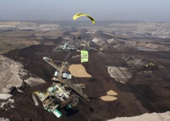 Mit einem Motorschirm ist ein Greenpeace-Aktivist heute über den Böschungsrutsch im sächsischen Braunkohle-Tagebau Vereinigtes Schleenhain bei Deutzen geflogen. Der Paraglider...